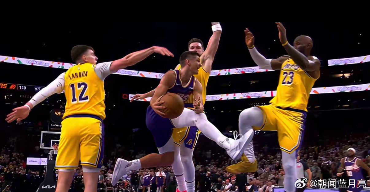 湖人为什么会被绝杀?东契奇的防守形同虚设,阿伦基本就是点名东契奇,最后阿伦这个突破,针对的就是东契奇,眼看东契奇防不住,詹姆斯、拉拉维亚一起协防,这时阿伦把球传给空位的奥尼尔,输球也就在情理之中。下图是阿伦突破,东契奇、詹姆斯、拉拉维亚防守阿伦的场景。