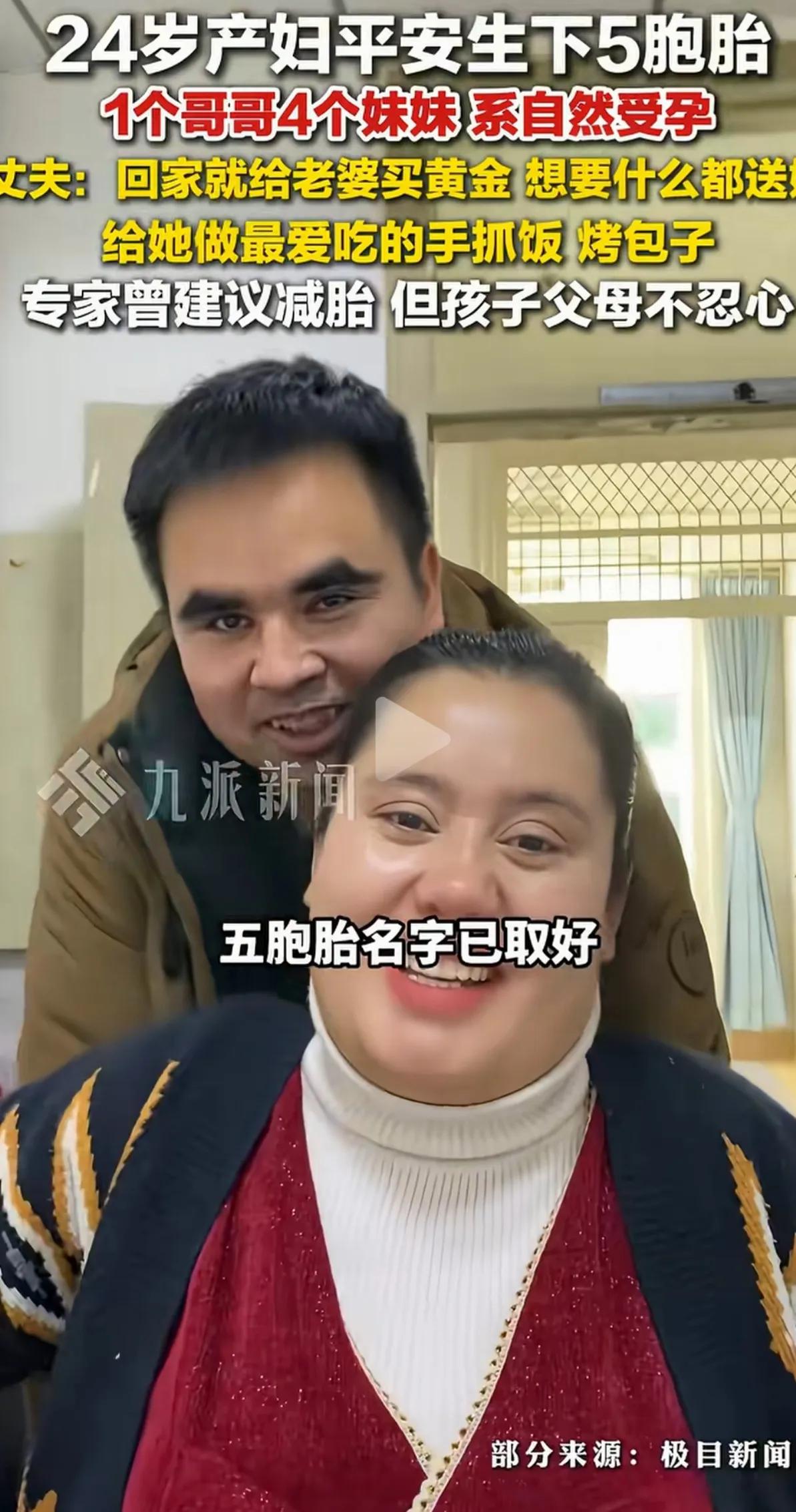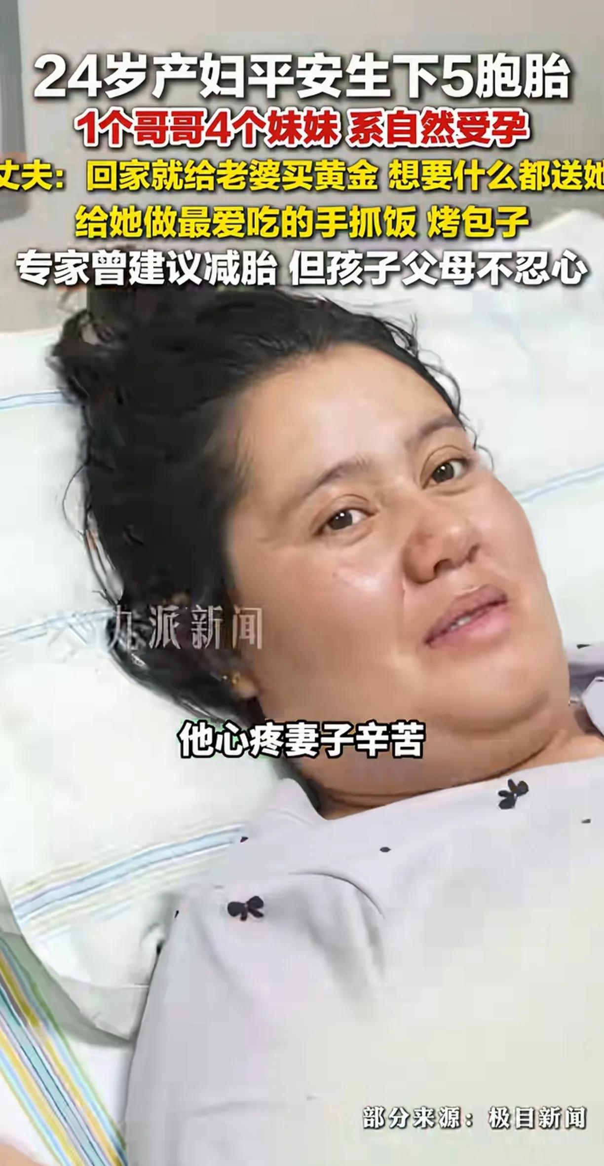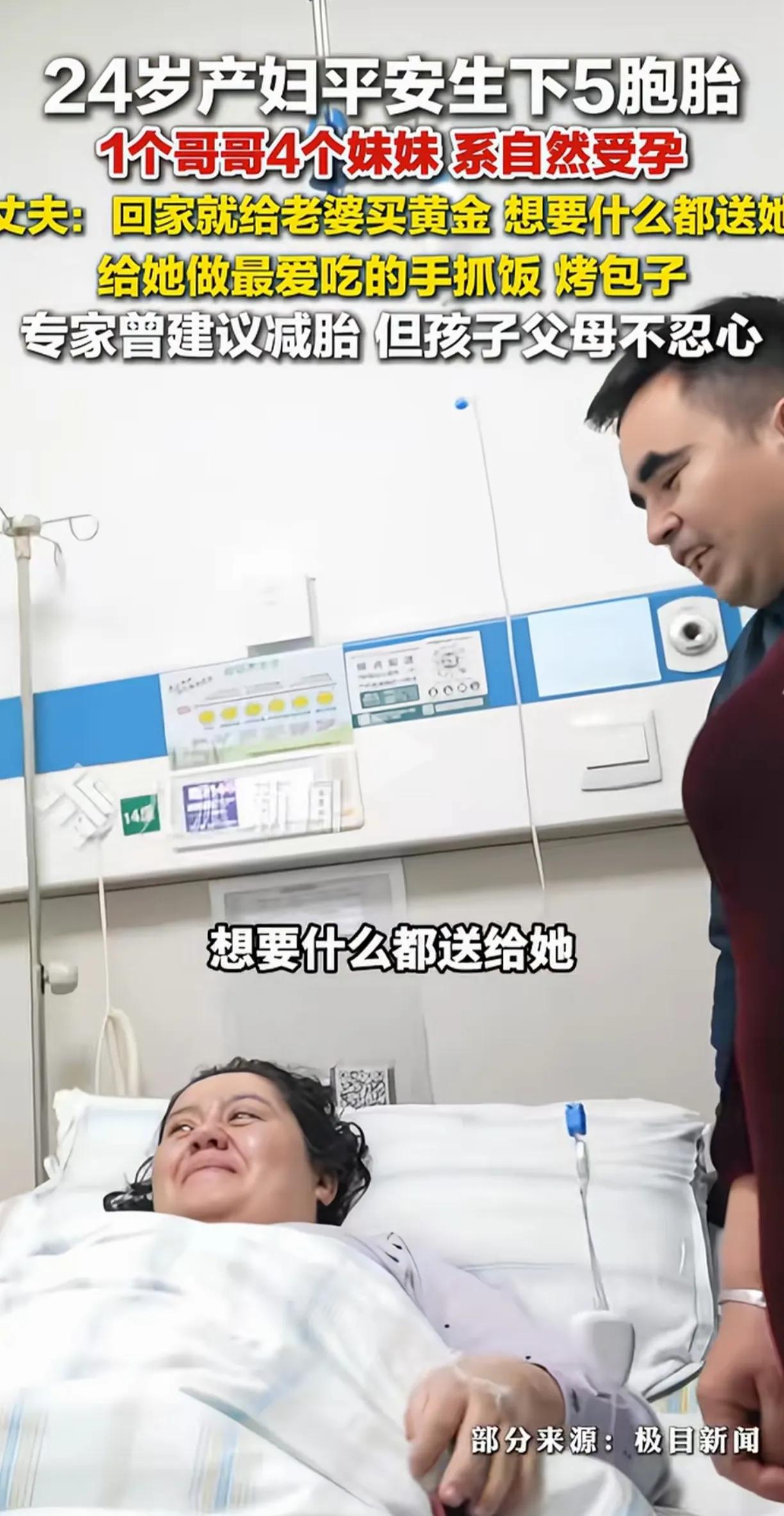 来自新疆的24岁产妇迪丽,自然受孕生下五胞胎,一男四女,怀孕期间也比较顺利,专家曾建议减胎,她跟丈夫不忍心,坚持到生,万幸出生都健康。 丈夫对她非常感激,回家了给她买黄金,做她最爱吃的手抓饭,烤包子。 她太幸运了,一次多胎,遭一次罪,实现了儿女双全。
