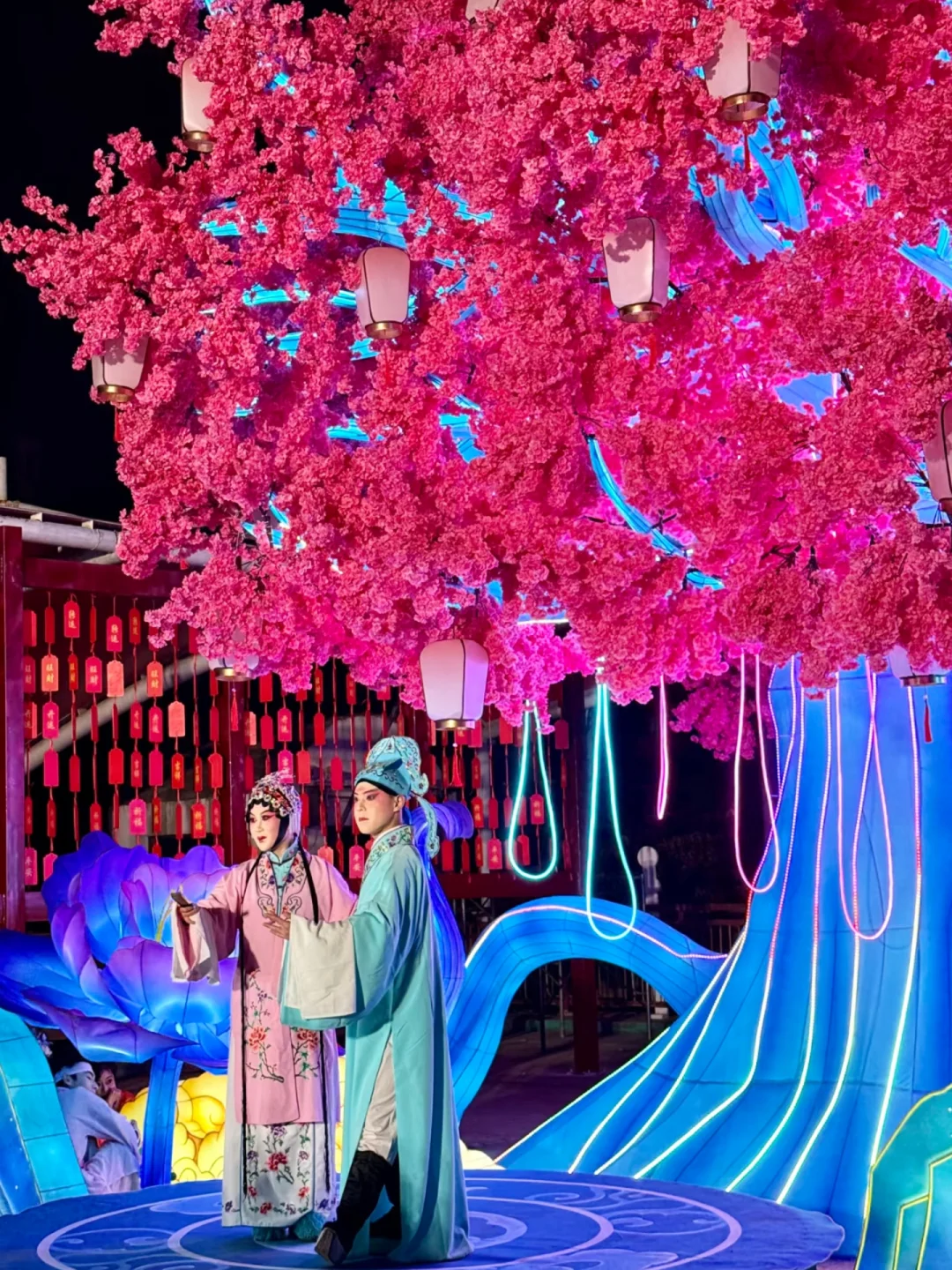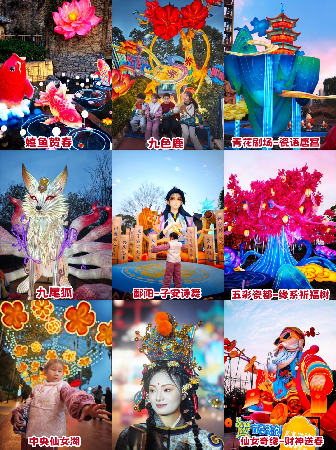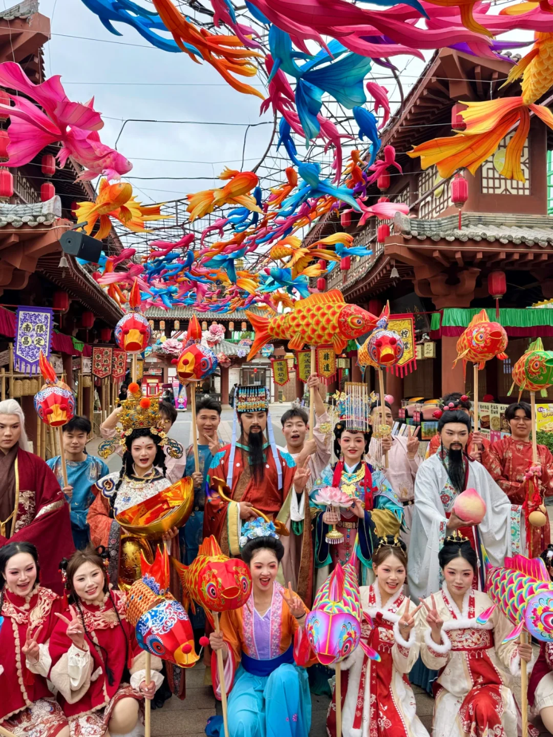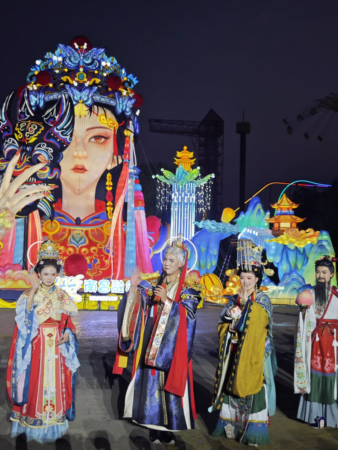 这个设计绝了,把江西非遗傩文化做成了巨形花灯,流光溢彩的简直像从壁画里走出来的一样。还有50米长的一夜鱼龙舞,红金配色直接把我美哭了。