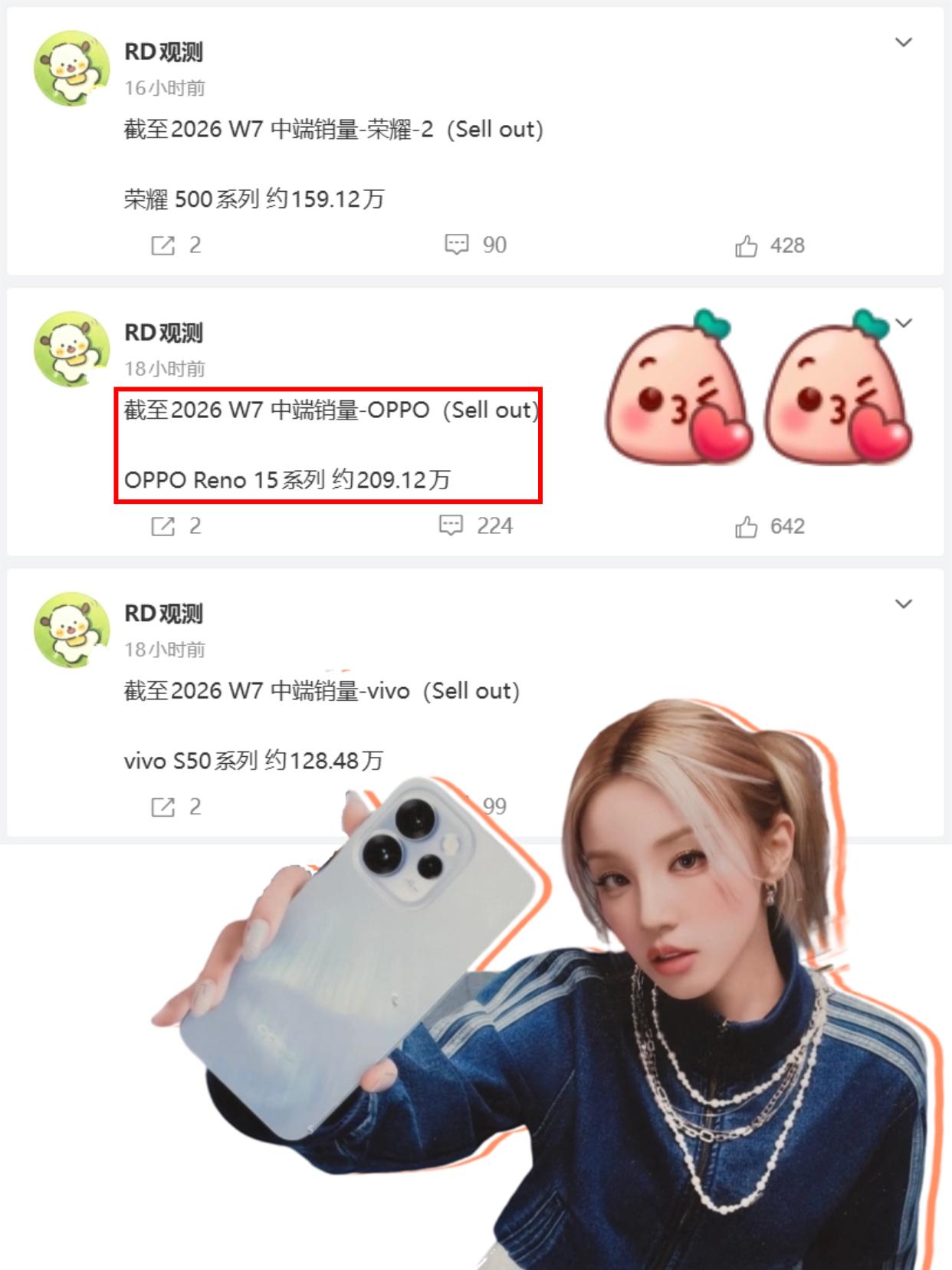 过年也卖爆啦,宋雨琦和Reno15太搭了! 之前我说OPPO Reno15会卖爆还好多人不信,现在数据来了,不得不信吧! 看这博主的爆料,Reno15已经连续好几周销量领先了,连春节大家放假也是,在2-4k价位段拿捏住了,根本不愁卖~ 主要是Reno15本身就很强,小直屏颜值高,手感跟iPhone 17差不多,三摄都没有凑数的,拍照很强,还有很多live图玩法,出圈实况不知道种草了多少人!ColorOS 16系统流畅度也是很优秀,各方面相当全面,而且还是雨琦同款,能卖爆也很正常啦~ 有没有买了Reno15的宝子说说,体验咋样哦?