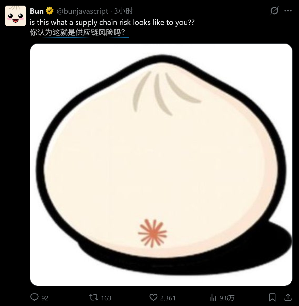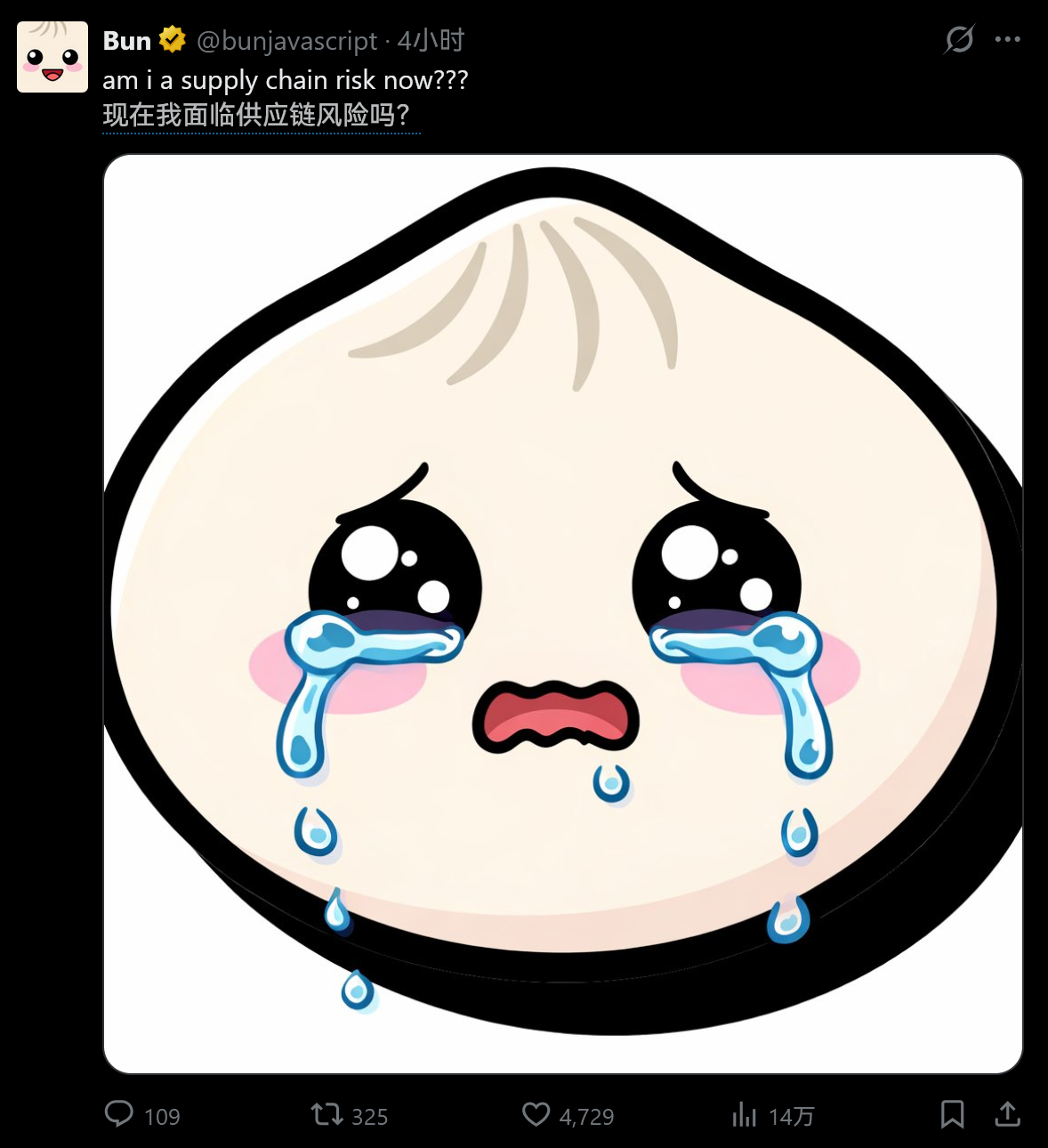 美国军方将Anthropic公司列为“供应链风险”后, Anthropic最近收购的Bun发的图还挺萌……
