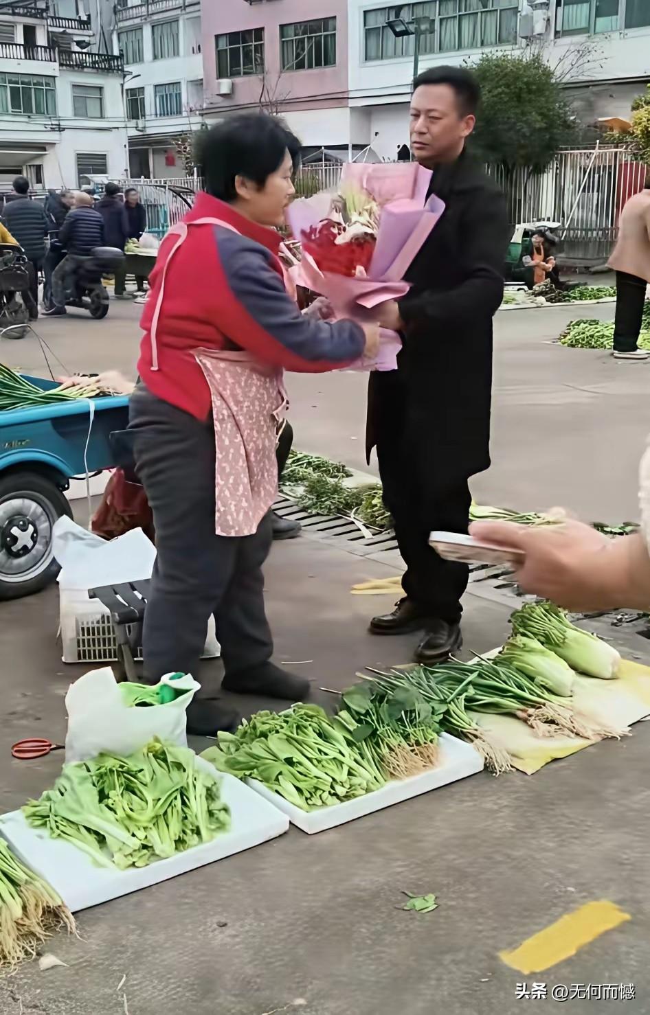 这个卖菜的大姐魅力也太大了,居然能吸引这个帅气的中年男人跪下献花,公开示爱,说明这大姐非常的优秀,肯定是一个通情达理,非常善良的女子,看到最后,也不知道这个卖菜的大姐最后接受没接受对方的追求,感觉这个男人如此心诚,也是非常不错的,如果两个人有缘分,就祝福两个人能够走到一起!