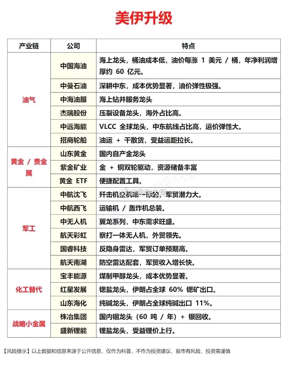 中东失控!美伊冲突升级,A股这五大板块下周能否掀涨停潮!?美伊冲突引爆避险狂潮,油气、黄金、军工、化工替代等主线值得关注。(1)油气板块中,中国海油依托成本优势尽享油价红利(2)黄金板块迎来避险资金涌入,紫金矿业、山东黄金等龙头价值凸显;(3)军工领域,中航沈飞、中无人机等企业承接中东军工需求,订单预期向好;(4)化工与战略小金属赛道,宝丰能源、红星发展等企业凭借产能优势,承接伊朗供给缺口带来的市场机遇。(5)中东冲突全面升级,霍尔木兹海峡随时可能被封锁,全球石油运输大动脉告急,中远海能、招商轮船值得关注……