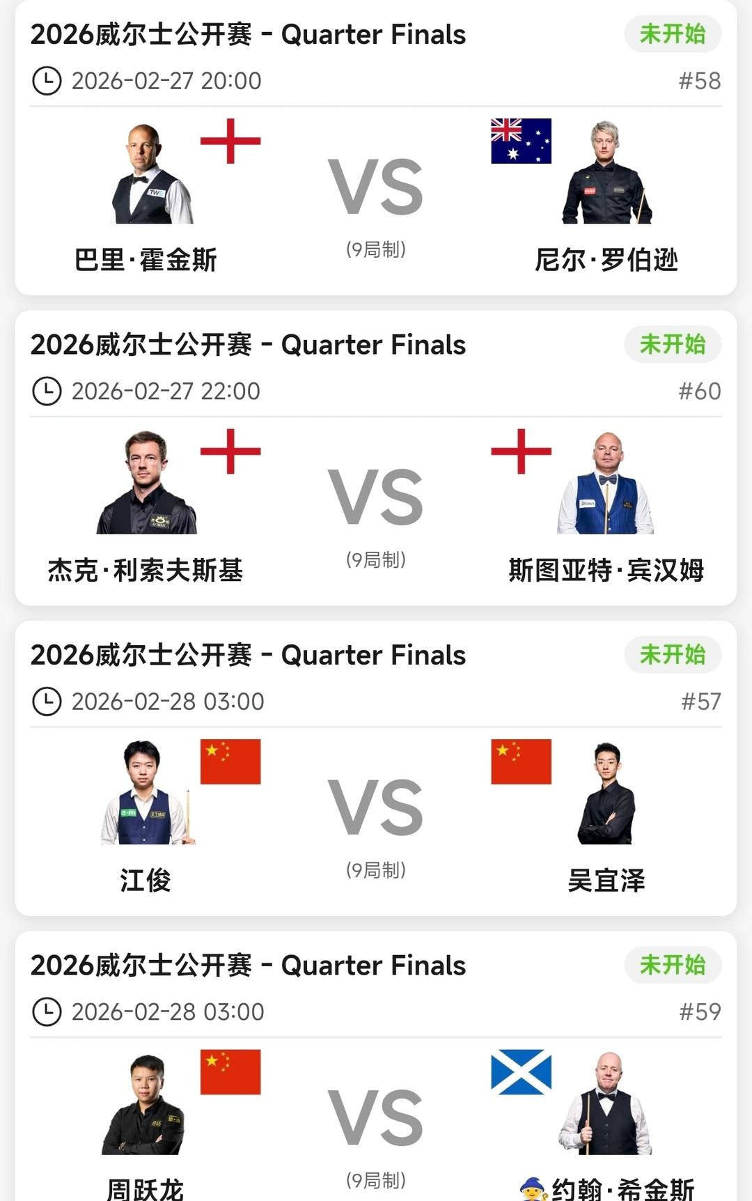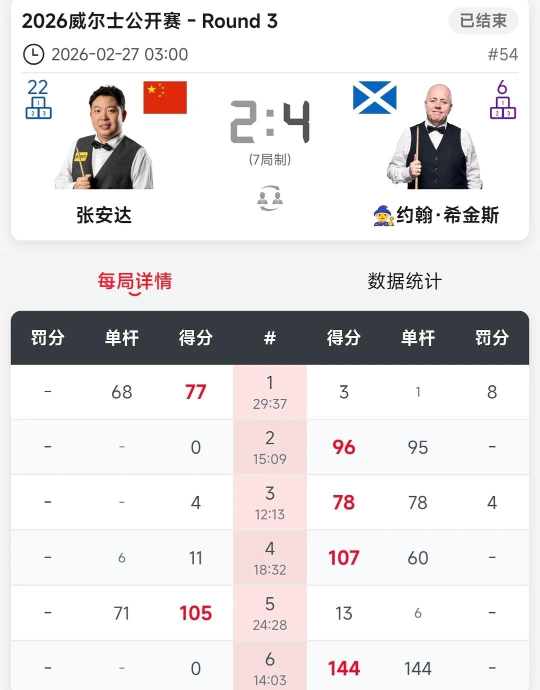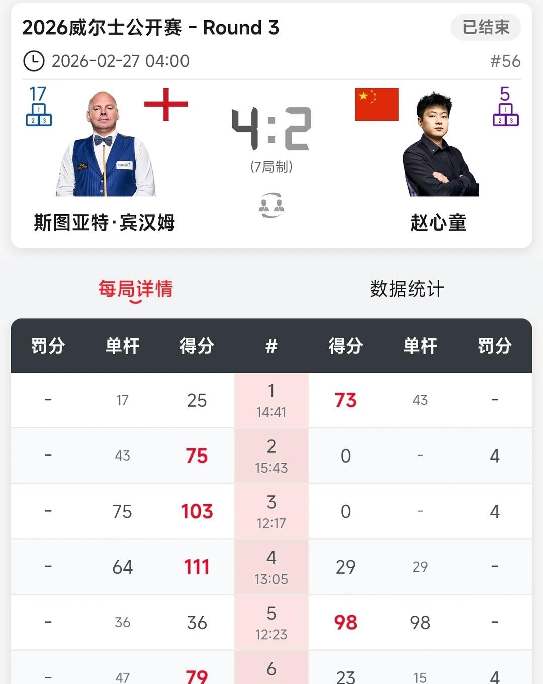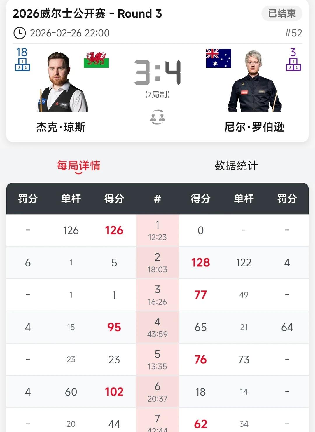 三人进8强 心童被二师兄终结11连胜 威尔士公开赛第三轮16进8比赛结束,江俊4:1拿下晋级与吴宜泽会师上半区8强,保一人进半决赛,吴宜泽状态更佳! 威廉姆斯被霍师傅2:4淘汰,本场发挥霍金斯更佳,火力准度在线。 琼斯与萝卜的比赛,看的一波三折,悬念不断,开局琼斯中长台红球打进单杆过百速胜,第二局萝卜也是同样上手单杆过百还以颜色。第三局萝卜在缠斗中超分速胜。第四局萝卜跟自己较劲,接斯诺克被罚64分,险些翻盘,琼斯也是虚惊一场比分2:2,后面两人纠缠到决胜局,萝卜走位更好,超分4:3晋级。下一轮将对阵霍金斯。 安达2:4希金斯止步16强,希金斯中盘的控制确实强。 小猪2:4小司机,后面两杆单杆超分带走比赛,状态更佳。 赵心童2:4宾汉姆,还是身体原因吧,本场二师兄发挥确实也更好,值得获胜,赵公子好好休整,再战! 周跃龙稳扎稳打,实力更突出,场面更优,支持小龙! 本土赛就看小司机跟小龙谁走的更远获得奖励了。