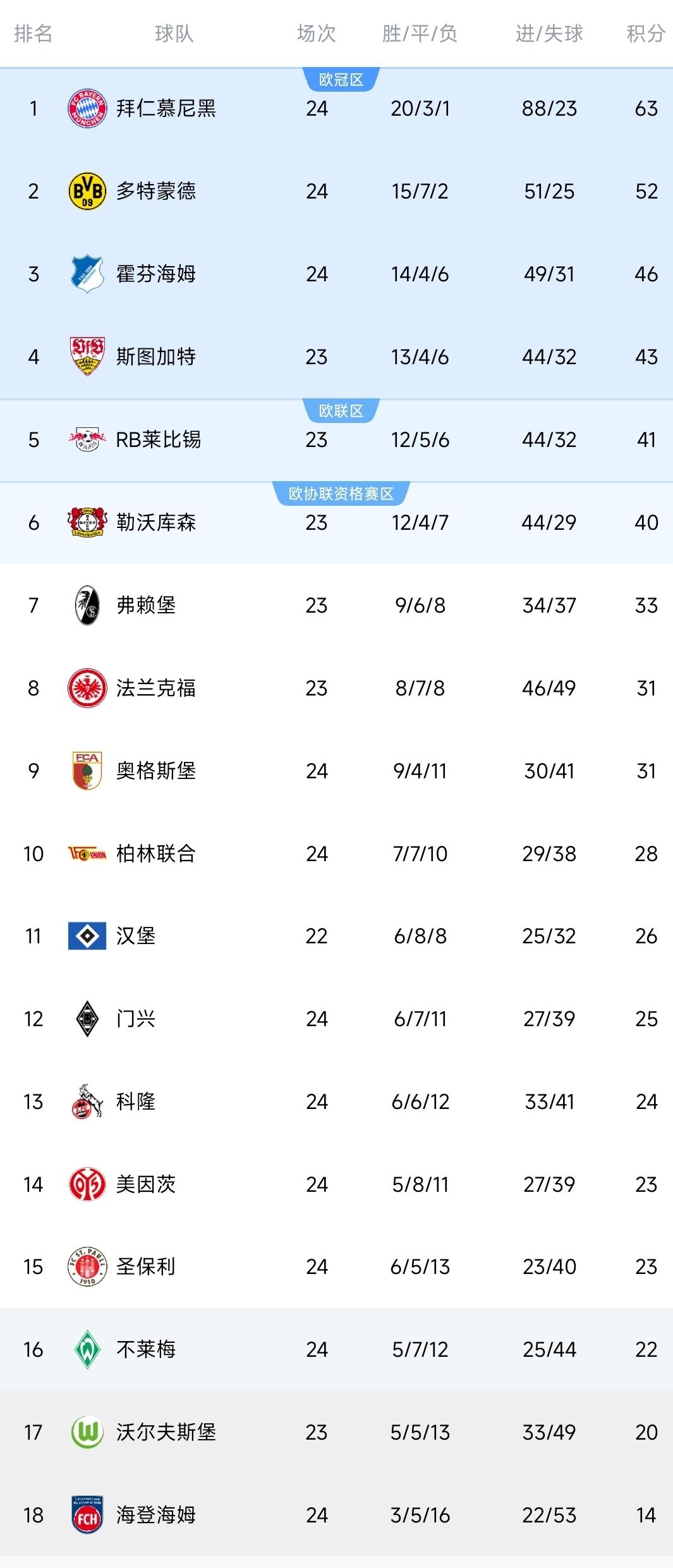 德甲最新积分榜! 拜仁3-2绝杀多特,稳居榜首,11分领跑。 北京时间3月1日,德甲联赛第24轮。 ①勒沃库森1-1美因茨。 ②圣保利1-0霍芬海姆。 拉格一锤定音,门将瓦西里屡现神扑拯救队伍,圣保利拼下重要的胜利,暂时逃离降级区。 ③门兴1-0柏林联合。 门兴局面绝对占优,却迟迟没有建树,终结着实堪忧,直到补时搏到点球,第94分钟迪克斯罚进绝杀艰难取胜。 ④拜仁3-2多特蒙德。 大黄蜂是幸运的,施洛特贝克铲球踢到斯塔尼希奇的脚踝位置逃过红牌,接着第19分钟他在定位球回合头球顶进打破平衡。主裁的吹罚不利于拜仁,这给他们造成一定困扰,最为关键是自己的进攻较差,没能踢出太多内容,上半场0-1落后。 易边再战拜仁慢慢有所起色,第53分钟基米希精妙策动,凯恩近距离包抄得手扳平。多特的防线压力倍增,第70分钟又是犯错,施洛特贝克禁区踢人送点,凯恩点球稳稳打进实现反超。 比赛没有简单的结束,第83分钟斯文松站出来破门,多特重新拉回同一起跑线。只是平衡局面没能持续太长时间,第87分钟基米希禁区一脚劲射入网绝杀,最终拜仁3比2逆转告捷,扩大榜首的优势变成11分。