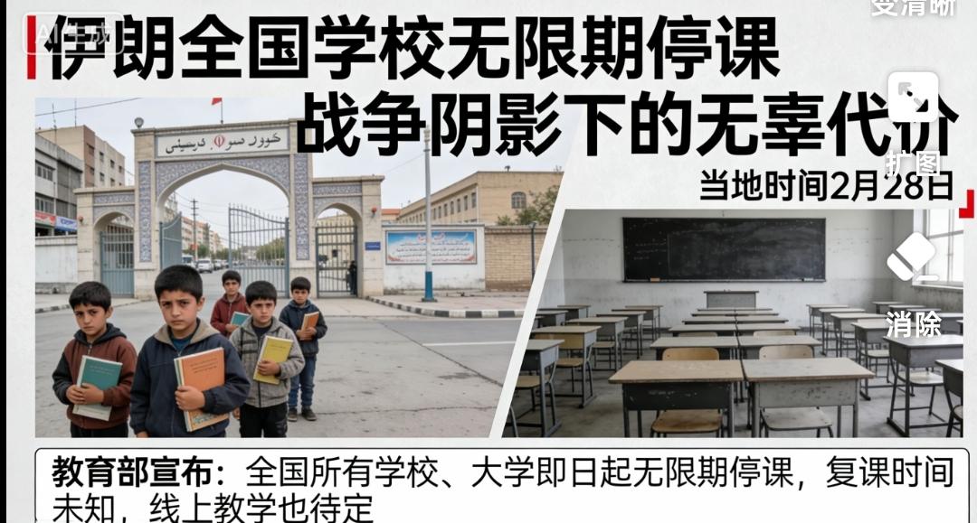 突发!伊朗全国学校无限期停课!战争阴影下,孩子成了最无辜的代价 当地时间2月28日,伊朗教育部突然宣布:全国所有学校、大学即日起无限期停课,复课时间未知,线上教学也待定。 这一决定,直接来自伊朗最高国家安全委员会的紧急指令。 背后原因,人人都清楚——美以军事打击已打响,战火蔓延、空袭不断,整个国家进入高度紧张状态。 校园本该是最安全的地方,如今却因战火被迫关闭。 孩子们不用上学,不是放假,而是避险。当炮火取代了读书声,当防空警报取代了上课铃,最让人心疼的,永远是无辜的平民与孩子。 东方大国早已明确表态:尊重主权、停止打击、对话谈判。 可现实是,局势仍在升级,普通人的生活被彻底打乱,未来充满未知。 再先进的武器,也换不来和平;再强硬的打击,带不来长久安稳。战争从来没有赢家,最先受伤的,永远是普通百姓和下一代。 你觉得中东局势还会继续恶化吗?谁在为这场冲突付出最沉重的代价?各位读者你们怎么看?