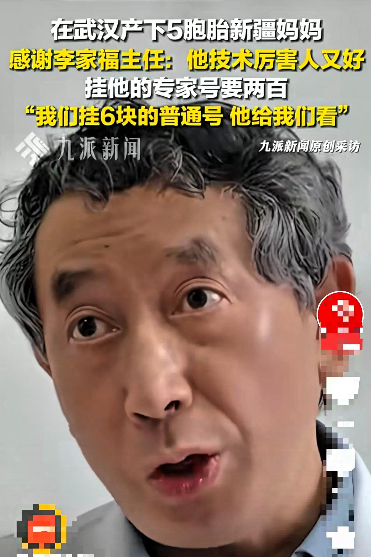 5胞胎的新闻出来,我第一反应不是惊叹,而是好奇! 能接手这样的高危多胎妊娠,需要极强的专业能力与责任担当,查询后得知,主诊医生是大家熟悉的李家福主任。 李家福是武汉大学中南医院产科主任医师,从业近40年,享受国务院特殊津贴,临床经验十分丰富,完成的高危产科手术超过3万例,在孕产妇和同行中口碑稳定。他因纪录片《生门》被很多人熟知,片中他对高危产妇的认真负责,让许多观众印象深刻。 多年来,不少情况复杂的孕产妇慕名从各地前来就诊,大家信任的,是他长期积累的临床经验与务实负责的态度。产科工作风险高、强度大,每一次诊疗都关系到母体与胎儿的安全,容不得半点疏忽。 如今再看李家福主任,头发已添不少白发,神态也透着长期高负荷工作的疲惫。这份变化,是多年坚守临床一线的真实印记。他没有过多宣传,始终把精力放在诊疗和手术上,用实际行动守护孕产妇的安全。 医疗工作的价值,往往不在轰动的场面,而在一次次平稳的守护。五胞胎顺利降生,是医疗团队专业协作的结果,也离不开李家福多年沉淀的经验与担当。 对医生而言,口碑不是靠流量,而是靠每一台手术、每一次沟通慢慢积累起来的。尊重医学规律,善待患者,踏实做好本职,才是医者最可贵的品质。 正是有这样长期坚守在高危一线的医生,许多家庭才能平安度过最艰难的时刻。向认真负责的医者致敬,也希望每一位坚守岗位的医生都能被理解与善待。