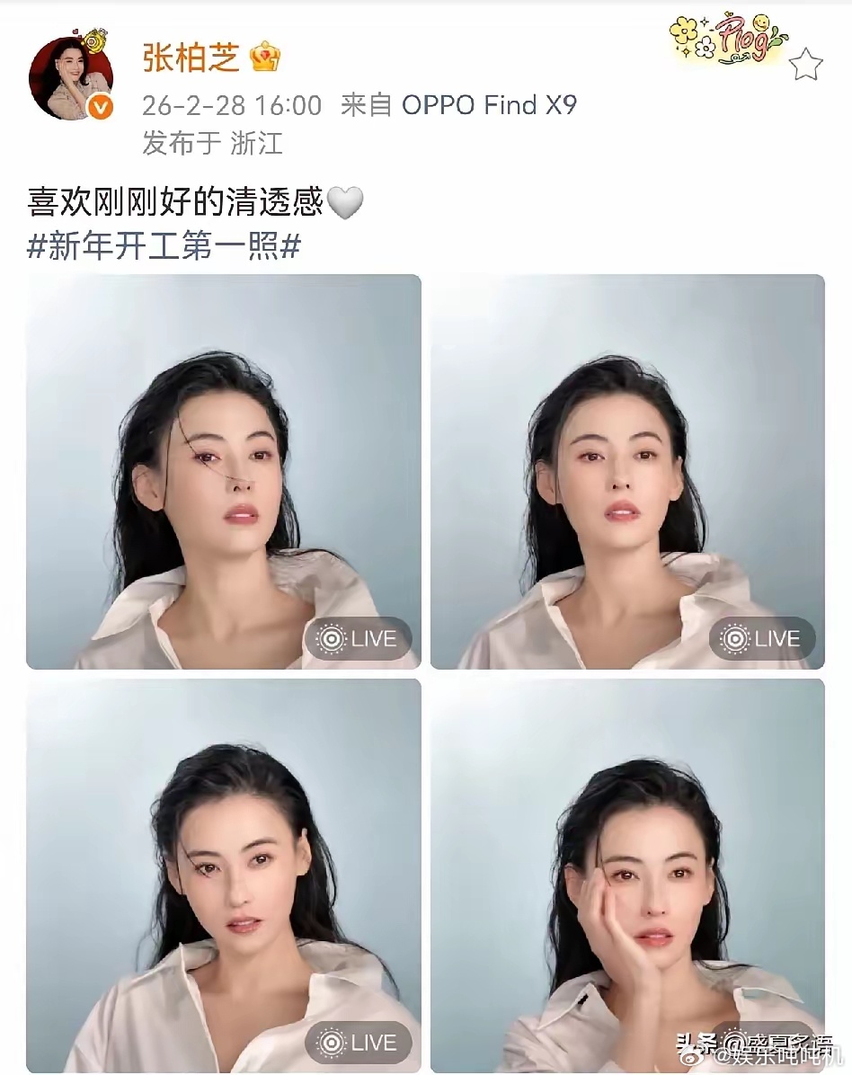 张柏芝,高调发文!2月28日,46岁的张柏芝突然高调发文,字里行间都是兴奋之情,还透露出一丝得意,原来,刚过完年的张柏芝,这次晒出了开工状态。并配文“喜欢刚刚好的清透感”,看到如此“清透”的美女,网友都不淡定了。镜头里的她状态堪称“逆生长”,完全看不出已是46岁且育有三子的妈妈。照片中,张柏芝以湿发造型出镜,几缕发丝轻贴脸颊,平添几分慵懒随性。她身着简约浅色系衬衫,领口微敞,既显温婉又不失利落。妆容主打清透裸感,眉眼间毫无疲态,肌肤白皙紧致,苹果肌饱满,标志性的星眸依旧清澈灵动,抬手托腮的瞬间,少女感扑面而来,与当年《喜剧之王》里的柳飘飘神韵重叠。