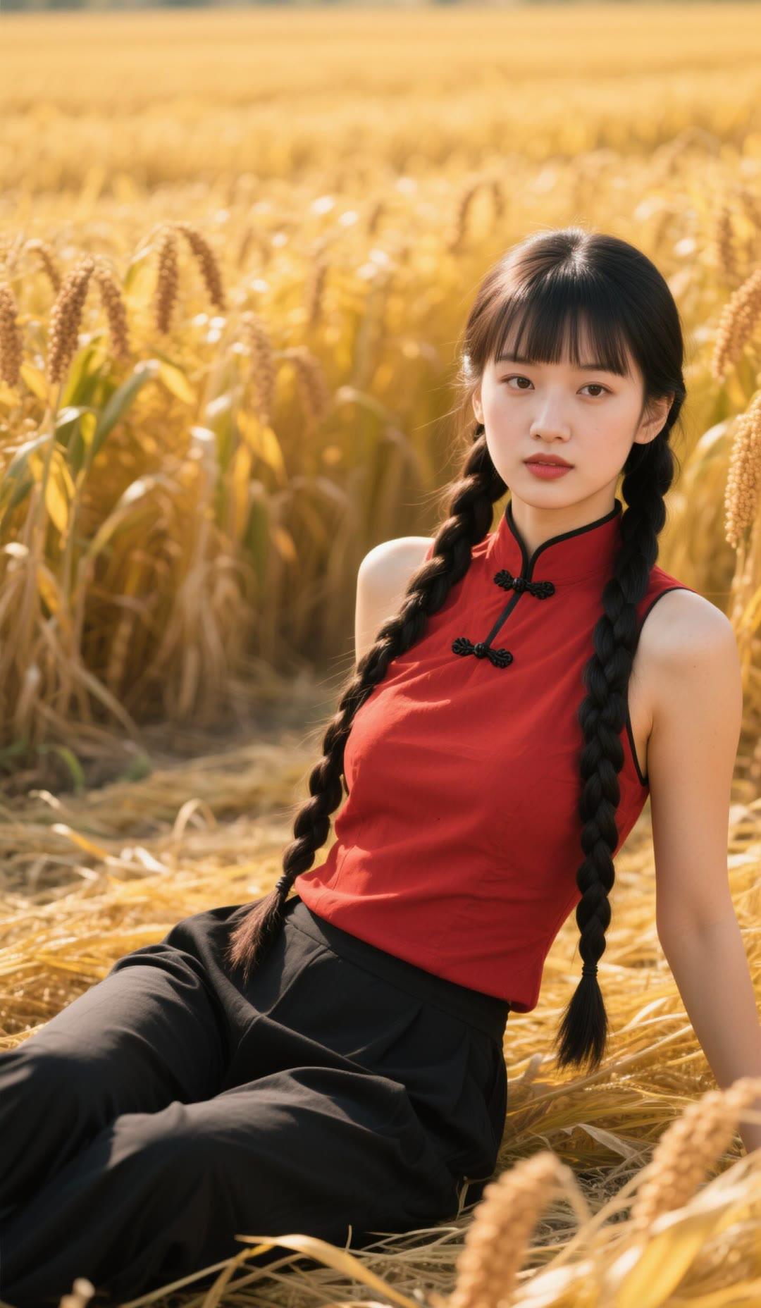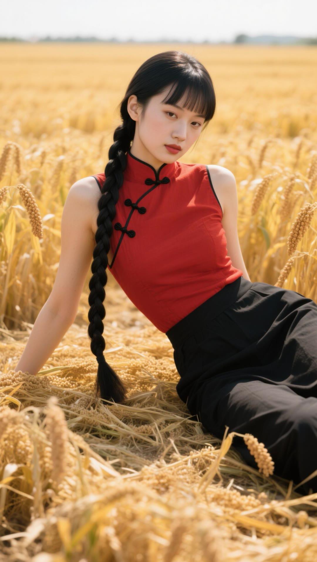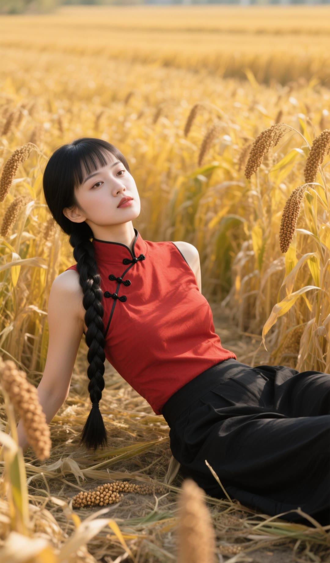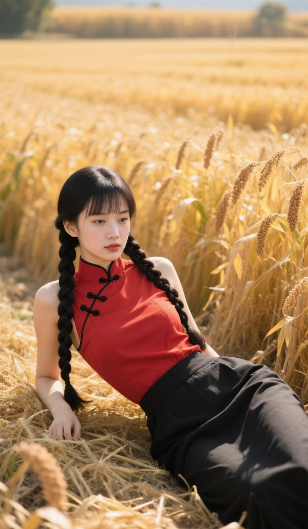 红衣美人卧麦田,黑发如瀑映金秋。