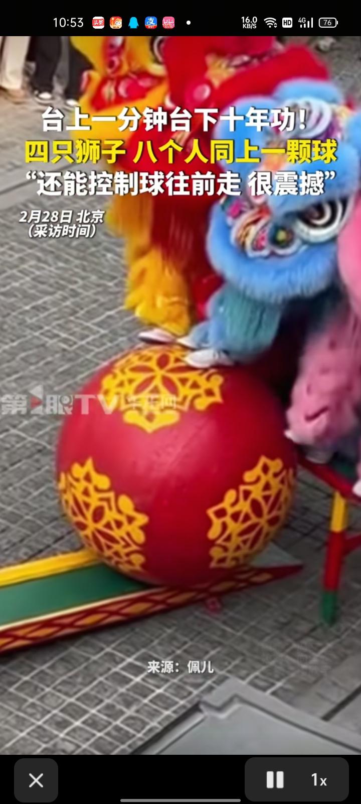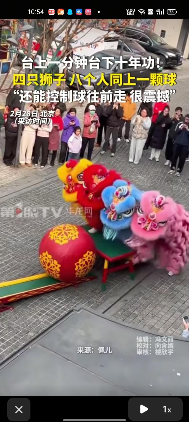 2月27日,北京。女子发视频称,他们在进行舞狮表演,四只狮子,八个人同上一颗球,还能控制球往前走,很厉害也很让人震撼,这些人估计是练就了几年的功夫,真就是善于挑战极限。