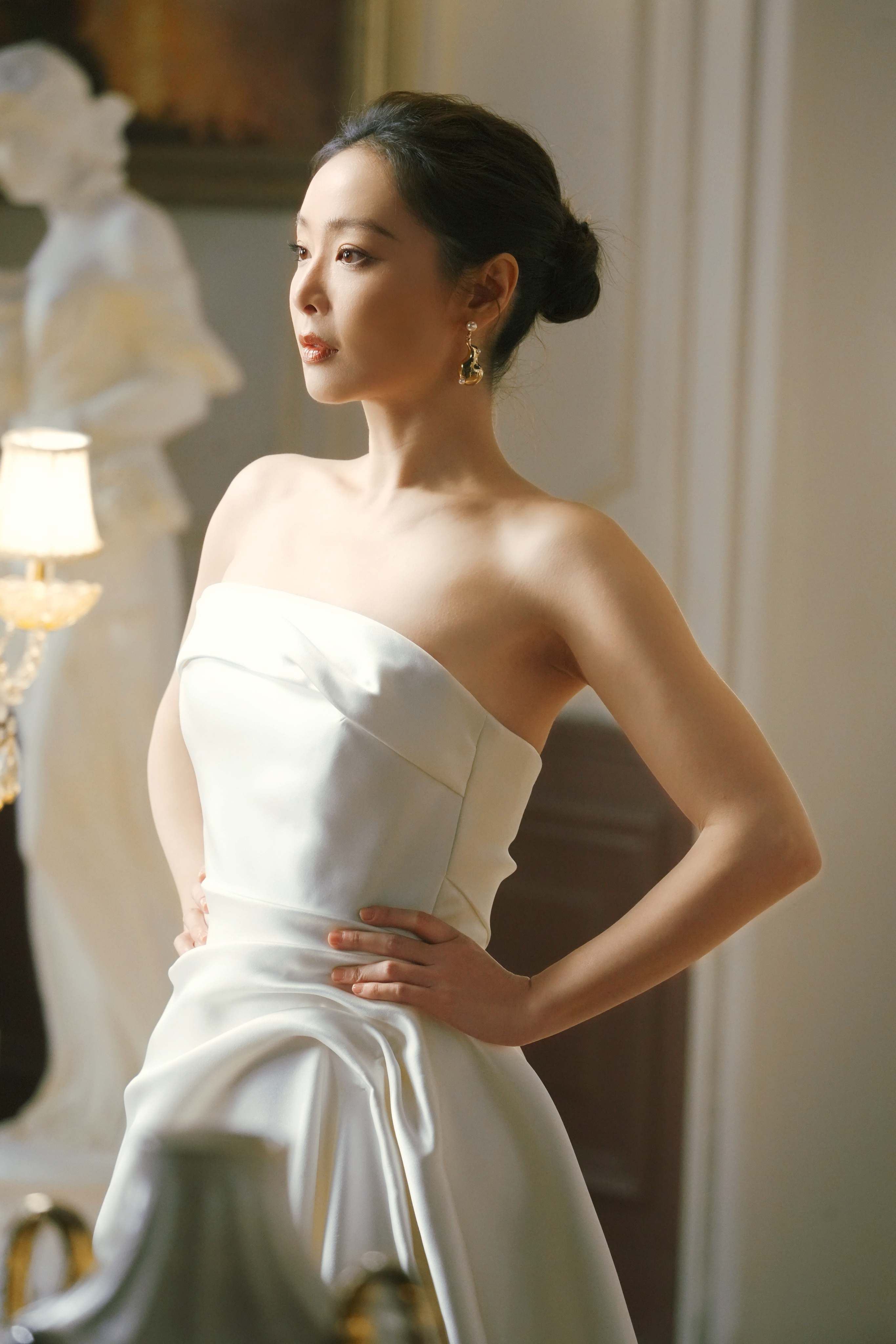 万鹏 白裙如月光倾泻,缎面裹着冷冽的温柔,开衩处露出的线条,是藏在优雅里的勾魂