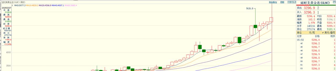 回顾一下, 2月份最后一个交易周, 国际金价连续合约运行情况。 当周国际金价低开高走, 开盘价为5128.8美元/盎司, 盘中最高价5299美元/盎司, 最低价5109.5美元/盎司, 收盘价5296.4美元/盎司, 上涨166.4美元,涨幅3.24%。 对于国际金价后市, 有望继续偏强运行!