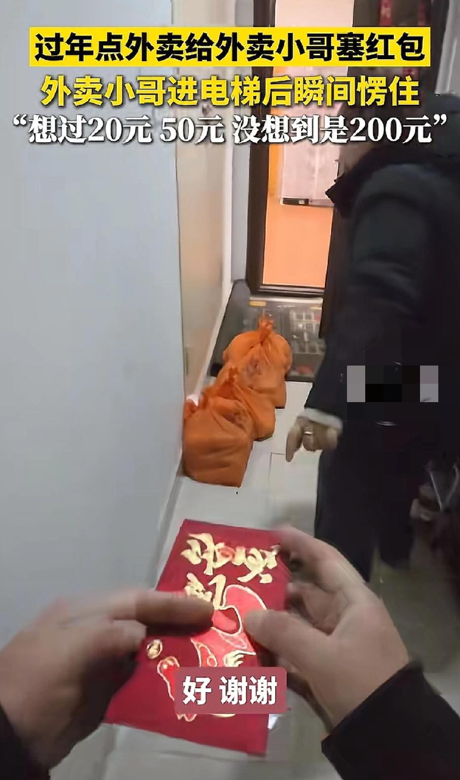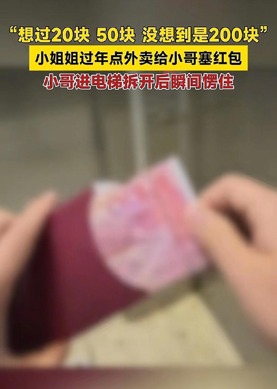 江苏,男子过年期间去送外卖,外卖送到后,顾客递给了男子一个红包,男子想过里面可能是20或者50元,没想到,他拆开后愣住了,里面竟然是200元,男子感动落泪称,他已经很久没有收到过新年红包。网友怒赞顾客太暖心。 春节,本是万家团圆、走亲访友的日子。可对很多外卖员来说,越是别人休息的节日,越是他们最忙碌的时候。 男子就选择在过年期间坚守岗位,多跑几单,多挣一点钱,让家里的日子能宽裕一些。 那天,他像往常一样,骑着电动车穿梭在城市的街道。 天气微凉,路上行人不多,家家户户都沉浸在过年的轻松氛围里,只有他还在争分夺秒地赶订单。 这一单,他要送到一栋居民楼里,因为订单东西多、分量不轻,他一路小心提着,生怕洒了、碰了。 到达楼层后,他没有直接敲门,而是按照顾客的要求,把几份东西整齐地摆放在楼道指定位置,然后轻声联系顾客出来取餐。 没过一会儿,房门轻轻打开。顾客走了出来,态度温和,没有丝毫催促和不耐烦。 男子礼貌地示意东西已经放好,正准备转身离开,赶往下一单。 可让他完全没想到的是,顾客突然从身后拿出一个红彤彤的新年红包,直接朝他递了过来。 外卖小哥当场愣了一下,连忙摆手推辞:不用不用,真不用。 他跑外卖这么久,见过各种顾客,收到过感谢,也遇到过委屈,但大过年被顾客主动塞红包,还是很少见。 他觉得自己只是做好本职工作,不值得顾客破费。 可顾客十分坚持,笑着把红包往他手里塞。 推让几下,男子实在拗不过,只好收下这份心意,紧紧攥在手里。 他看着顾客手里东西不少,又贴心地多问了一句:需要我帮你提进去吗? 顾客笑着摇了摇头:不用,谢谢你。 简单道别后,男子转身走向电梯。他心里又暖又不好意思,一路上都在悄悄猜测:红包里大概是20块钱,或者50块钱。 不管多少,都是人家的一片心意。对他来说,这份被惦记、被尊重的感觉,比钱更重要。 电梯门缓缓打开,他走了进去。周围暂时没人,他终于忍不住,好奇又期待地拆开了手里的红包。 他本以为会是一两张小额钞票,可当红包完全打开的那一刻,外卖小哥整个人都愣住了,眼睛一下就红了。 他拉出来发现是100元,然后他又轻轻一转,又多出了一张100元。 没想到是整整200元。 两张崭新的钞票,安安静静躺在红包里,分量不大,却重得让他瞬间破防。 这个在寒风里跑了一天、再累也没喊过苦的男人,在狭小的电梯里,看着手里的红包,控制不住地鼻头一酸,眼泪差点掉下来。 事后男子称,自己在外打拼这么多年,早就不记得,上一次收到新年红包是什么时候了。平时为了生活奔波,受委屈、扛压力、赶时间,都是常态。 他从没想过,自己一份普通、甚至有些卑微的工作,会被陌生人这样温柔地看见、体谅、心疼。 200块钱,不多,却足够照亮一个普通人疲惫的春节。 视频传开后,网友们纷纷怒赞:这才是过年最该有的样子。善良不用多贵,体面又温暖。 有人说,陌生人的善意,最容易让人破防,小哥问要不要帮忙提进去,就知道这小哥很实在。 有人为生活奔波,有人懂得心疼奔波的人。一个小小的红包,装的不是钱,是尊重、是体谅、是藏在烟火气里最朴素的温柔。 对这个外卖小哥来说,这个春节,不只有寒风和订单,还有一份陌生人给的、记一辈子的温暖。   《民法典》第657条规定 :赠与合同是赠与人将自己的财产无偿给予受赠人,受赠人表示接受的合同。 顾客给外卖小哥200元红包,完全合法,属于《民法典》规定的无偿赠与,外卖小哥可安心收下,顾客事后不能随意要回。 红包已交付、外卖小哥已拆开,200元所有权已归外卖员,顾客事后反悔也无权索回。 一个红包,传递的不只是祝福,更是人与人之间最珍贵的善意。 愿每一个努力生活的人,都能被世界温柔以待。