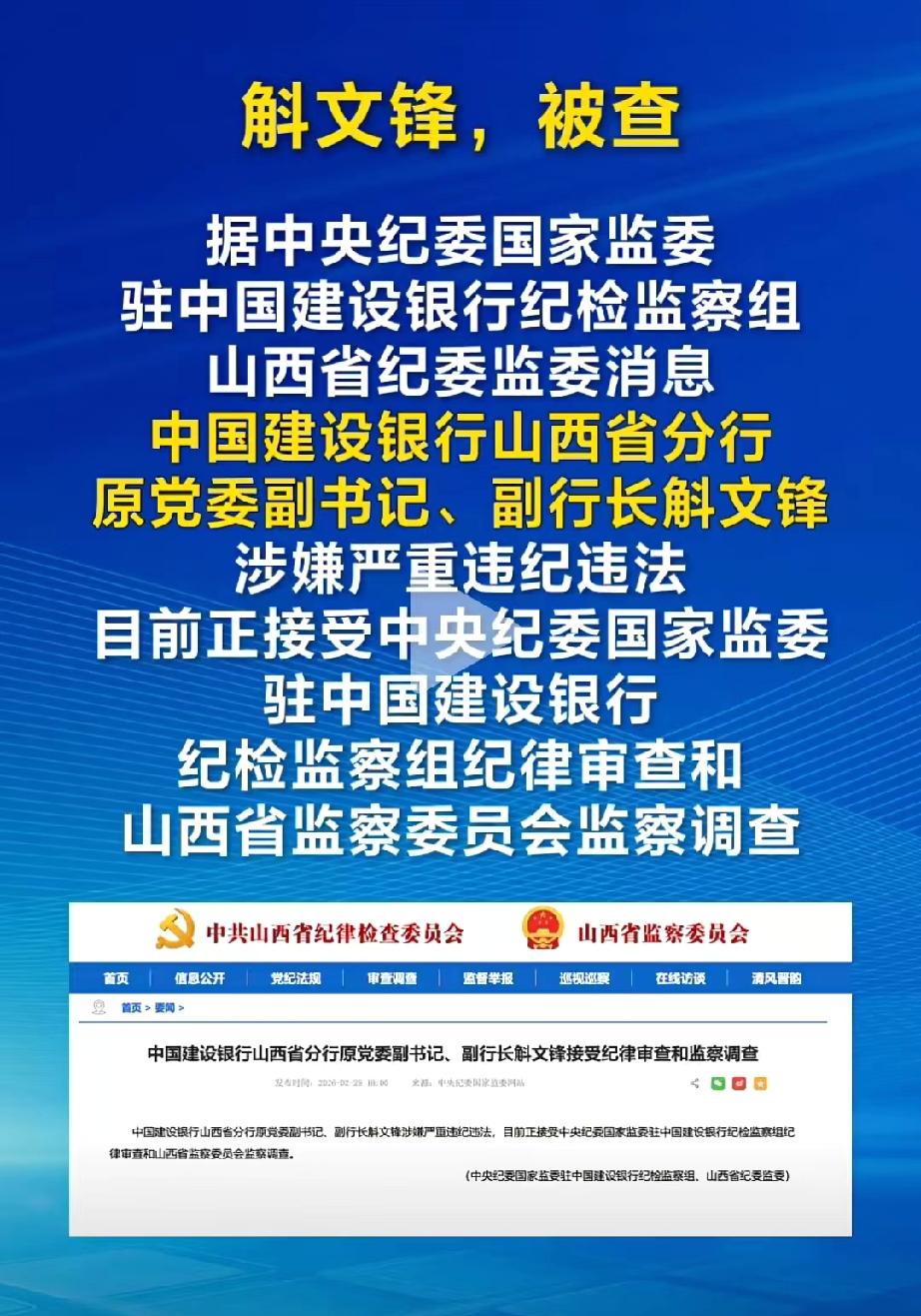 金融系统又捞了一条大鱼! 今天刷到中国建设银行山西省分行斛文锋栽了的消息,真是拍手称快。 试问一下银行岗位是多少大学生们,都想选择的好岗位。工资高,福利高。 有的人身居高位,享受着优厚的薪资待遇,却还能忘却初心,贪心作祟,欲壑难填,这样的人才最让人痛恨。 这个斛文锋,网上关于他的公开资料较少,出生年月不详,但是从官网发布的照片来看,他身穿白色衬衫,戴着一副眼镜,长得也是文质彬彬,没想到却是一个双面人,有着两副面孔。台上讲廉洁,台下搞腐败。 他拥有大学学历,又是在职研究生。 曾经在金融系统工作多年,尤其是在中国建行深耕30余载。 此前曾担任过中国建设银行吕梁中心支行行长,中国建设银行山西省分行党委委员、副行长、中国建设银行山西省分行党委副书记、副行长。 可以说是身居要职,权力很大,拥有很大的资金调配审批权。 中国建设银行作为我国的四大行之一,其金融实力非凡,是由中国政府(财政部、中央汇金公司),直接管控,代表着中国金融体系的核心力量。 斛文锋的落马,也再一次说明,金融系统里还有潜在的蛀虫很多,纪委同志还需再接再厉,将这些隐藏在黑暗面的蛀虫一个一个连根拔起,早日让他们接受法律的严惩。