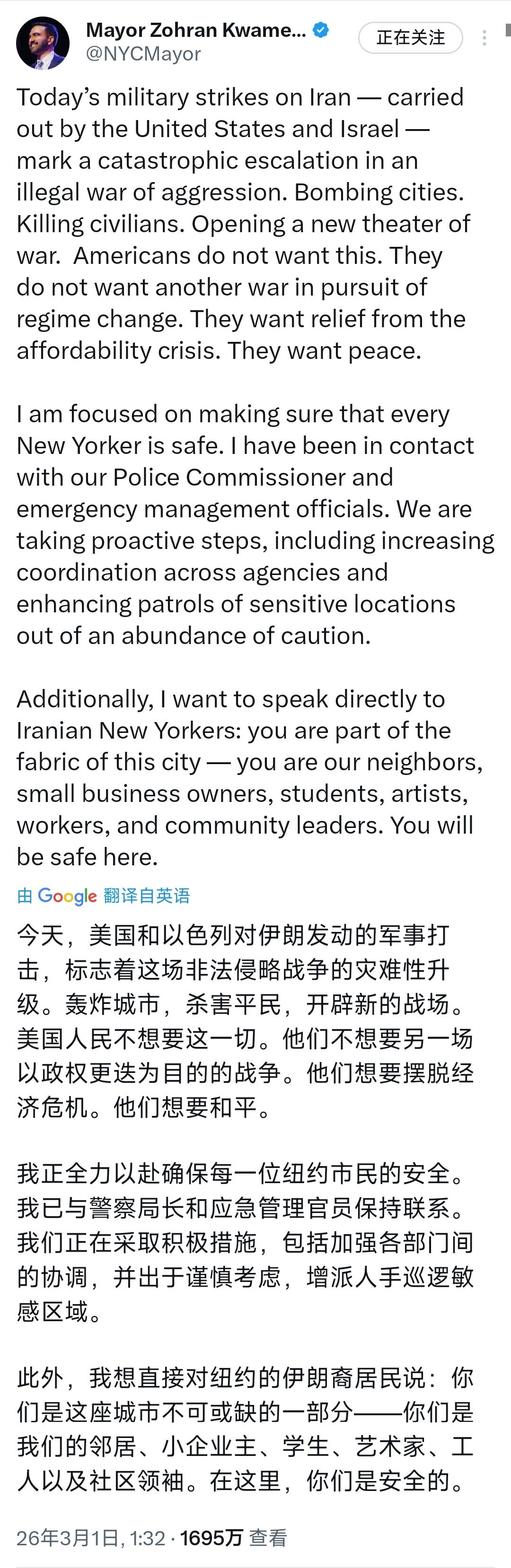 3月1日,纽约市长马姆达尼发文:“今天,美国和以色列对伊朗发动的军事打击,标志着这场非法侵略战争的灾难性升级。轰炸城市,杀害平民,开辟新的战场。美国人民不想要这一切。他们不想要另一场以政权更迭为目的的战争。他们想要摆脱经济危机。他们想要和平。我正全力以赴确保每一位纽约市民的安全。我已与警察局长和应急管理官员保持联系。我们正在采取积极措施,包括加强各部门间的协调,并出于谨慎考虑,增派人手巡逻敏感区域。此外,我想直接对纽约的伊朗裔居民说:你们是这座城市不可或缺的一部分你们是我们的邻居,小企业主,学生,艺术家,工人以及社区领袖。在这里,你们是安全的。” 说白了,纽约市长马姆达尼的发文,表面是履职表态、保障市民安全,实则是公开与特朗普对伊战争政策划清界限,借民生与和平诉求发声,更是美国内部分裂、反战情绪高涨的真实写照。 要知道,马姆达尼的表态绝非普通的市政安全声明,而是在特朗普联合以色列发动对伊空袭、战火升级的关键时刻,发出的反战宣言与民生呼吁。他的直言,字字戳破特朗普政府“正义战争”的谎言,更精准道出美国民众的核心诉求:不想要政权更迭战争,只想摆脱经济危机、渴望和平。这背后,是美国国内大规模反战抗议的蔓延,从华盛顿到纽约,无数民众谴责特朗普未经国会授权便发动战争,指责其借对外冲突转嫁国内矛盾,而马姆达尼的发声,正是对这份民意的呼应与回应。 可这绝非单纯的反战表态,更是马姆达尼立足纽约市政职责的清醒履职,也是其一贯政治立场的延续。作为纽约市首位穆斯林市长、首位印度裔市长,马姆达尼向来关注少数族裔权益,也始终反对美国的霸权战争行径——此前他就曾公开反对美国抓捕马杜罗,在巴以冲突期间发起绝食呼吁停火。此次他明确表示“全力以赴确保每一位纽约市民的安全”,已与警察局长、应急管理官员密切联动,采取加强部门协调、增派警力巡逻敏感区域等措施,这并非空谈,而是贴合纽约当前的安全需求。 而马姆达尼最暖心、也最具深意的,是对纽约伊朗裔居民的直接喊话。据统计,美国约有150万伊朗裔居民,其中纽约有近2万名伊朗裔,马姆达尼明确表态“你们是这座城市不可或缺的一部分,是我们的邻居,在这里你们是安全的”,不仅是安抚伊朗裔居民的情绪,更是在反对种族歧视、守护多元包容的城市底色,也间接驳斥了特朗普政府将伊朗标签化、妖魔化的极端话术,展现出与霸权思维截然不同的执政理念。 更关键的是,马姆达尼的发文,本质是美国内部分裂的鲜明体现。一边是特朗普政府一意孤行,靠战争转移国内矛盾——当前特朗普正面临明尼阿波利斯公民权利争议、爱泼斯坦案解密、关税政策被裁定违法等多重压力,发动对伊战争成为其劫持叙事、掩盖内政困境的手段;一边是地方官员、民众的坚决反对,马姆达尼作为纽约市长,公开指责战争非法、呼应民众和平诉求,既是对特朗普霸权决策的无声抵制,也是美国两党博弈、民众与政府对立的外显。毕竟,70%的美国民众反对对伊战争,大家更关心如何摆脱经济危机、改善民生,而非卷入一场无意义的政权更迭战争。 说实话,马姆达尼的表态,既有市政官员的责任与担当,也有对和平的坚守与对少数族裔的关怀。他没有盲从联邦政府的战争决策,而是立足纽约市民的根本利益,一边警惕战争带来的安全风险、积极部署防护措施,一边发声反对非法战争、呼应民众诉求,这份清醒与担当,在当前美国霸权思维泛滥的背景下尤为难得。他的发文也传递出一个明确信号:美国人民的和平诉求不容忽视,霸权战争终究不得人心。 要清楚,马姆达尼的反战发声,不是孤立的,而是美国国内反战浪潮的一个缩影。随着美以对伊打击持续升级,伊朗的复仇行动已经启动,美军基地遭袭、全球能源价格面临暴涨风险,这场战争最终的代价,终将转嫁到美国民众身上。马姆达尼的表态,既是在提醒特朗普政府,战争没有赢家,也在守护纽约市民的安全与福祉,更在呼吁回归和平、聚焦民生——这才是美国民众真正想要的,也是一个负责任的政府应该坚守的底线。 而未来,随着中东战火越烧越旺,美国国内的反战情绪只会进一步激化,马姆达尼的发声或许会带动更多地方官员站出来反对战争。但可以肯定的是,只要特朗普政府不停止霸权冲动,这场非法战争带来的灾难,终将反噬美国自身,而马姆达尼所坚守的和平与民生理念,终将成为更多美国民众的共同追求。 说到底,马姆达尼的发文,是和平的呼吁,是责任的坚守,更是对美国霸权战争的有力驳斥。他用温和却坚定的话语,既守护了纽约市民的安全、温暖了伊朗裔居民的心,也道出了美国民众的真实心声:拒绝战争,渴望和平,期盼摆脱经济危机、过上安稳日子。 以上是小编个人看法,如果您也认同,麻烦点赞支持!有更好的见解也欢迎在评论区留言,方便大家一同探讨。