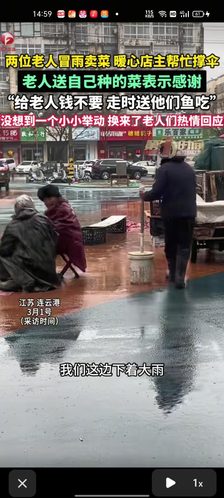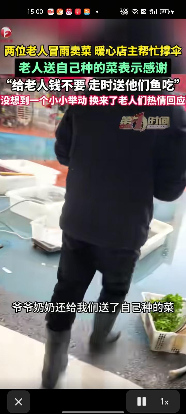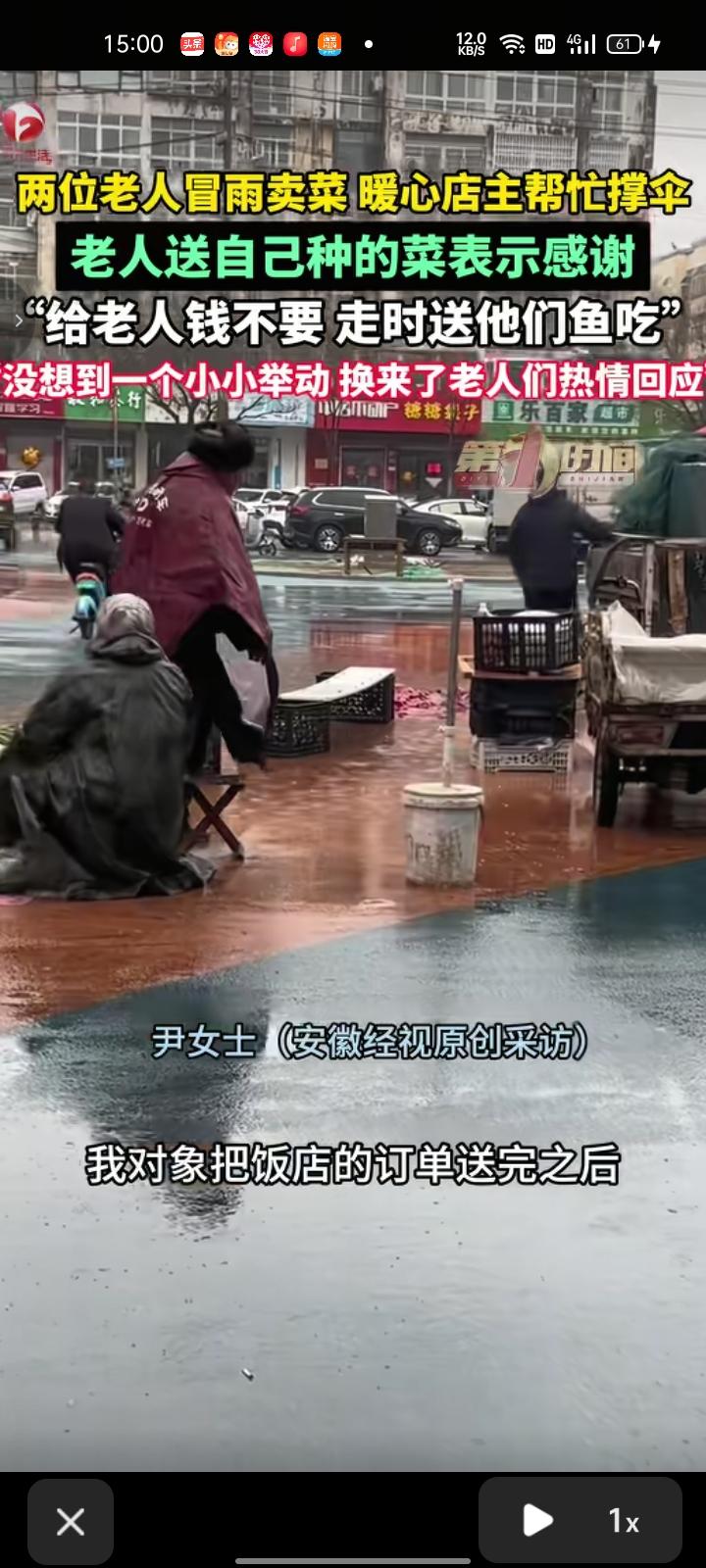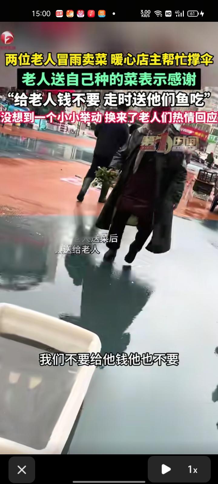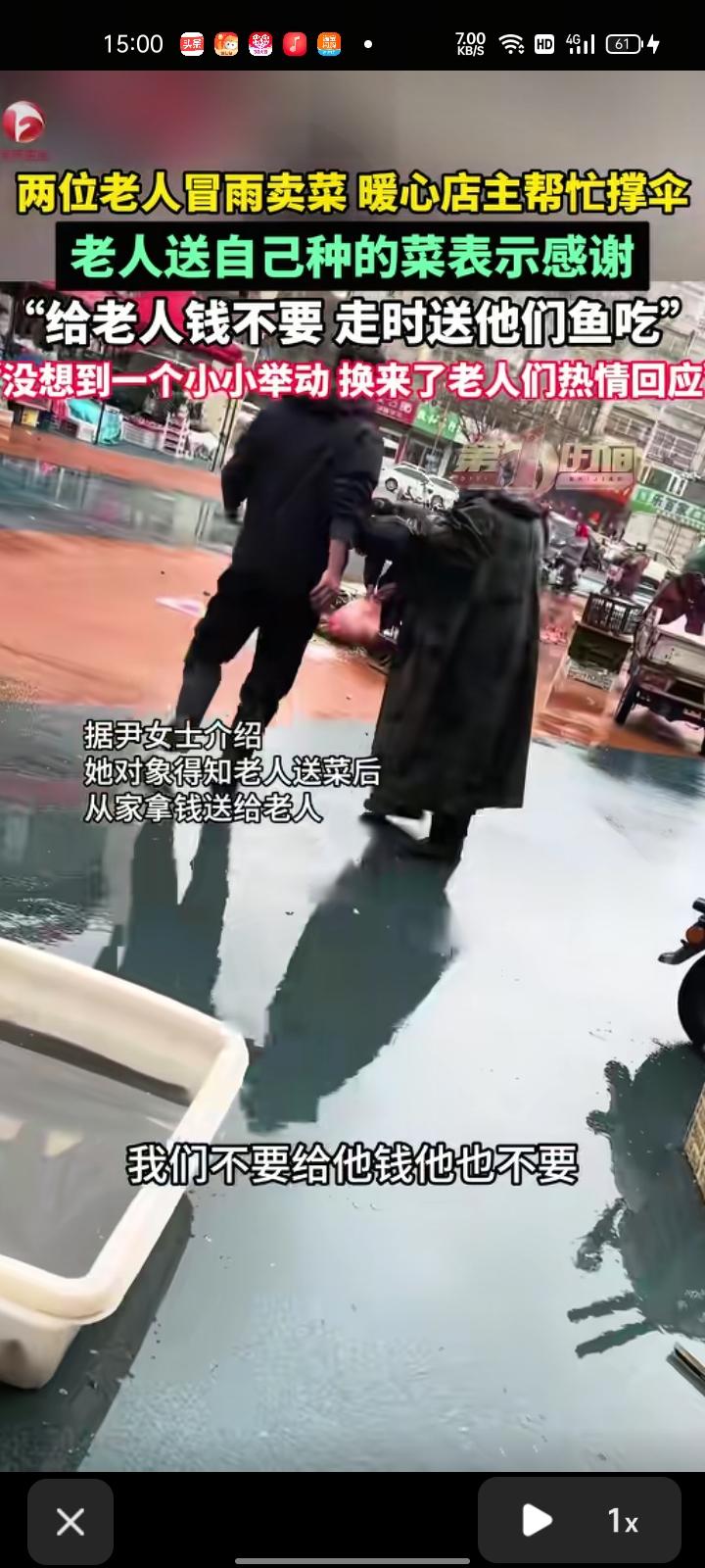 2月26日,江苏连云港。两位老人冒着雨卖菜,店主把饭店订单送完后,不忍心看着老人受苦,就暖心帮他们撑伞。事后,老人还送自家种的菜以示感谢。 尹女士称,她对象得知老人送菜后,从家拿钱送给老人,老人不要,走的时候给他们带一条鱼吃,没想到一个小小举动换来老人们热情回应。