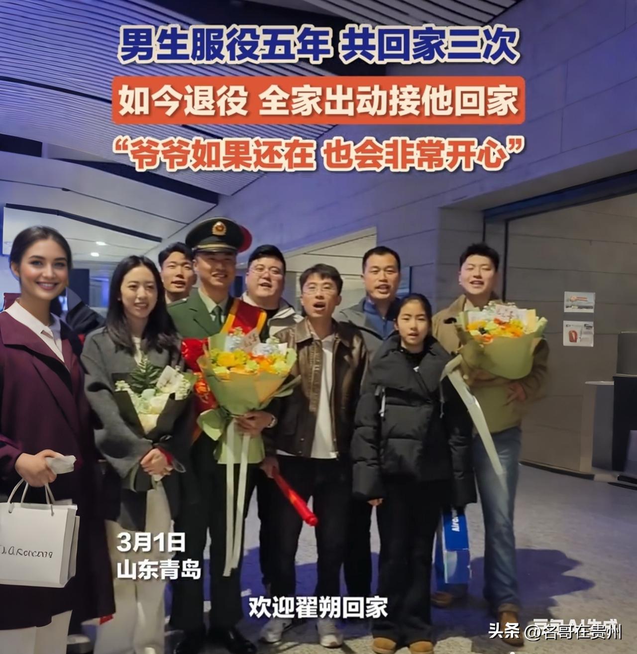 “5年只回3次家,青岛老兵一句话,直接把我看哭了……” 山东青岛,3月1日,一个再普通不过的退役返乡现场,却因为一个细节,让全网几千万网友瞬间破防。当那个穿着军装的小伙子走出车站,一家人蜂拥而上,有笑的,有哭的,还有跳起来拥抱的。看着挺热闹,可仔细一听这背后的故事,心里头像被什么东西狠狠撞了一下,酸得说不出话。 这小伙子在部队待了整整5年。5年,1800多个日夜,对于咱们普通人来说,可能就是眨眼之间的事。可对于他和他家里人来说,那是望眼欲穿的1800多天。这5年里,他一共只回过3次家。 这个数字一出来,你就知道分量有多重了。为什么回得这么少?因为他把时间都给了国家,把青春钉在了哨位上。 可就在去年,有一件事,成了他心里头永远补不上的遗憾。那天他刚执行完一个重大任务,心里头还想着赶紧给家里报个平安,结果传来的却是爷爷去世的噩耗。他甚至没能赶回去见最后一面,连送爷爷一程的机会都没有。 那一刻,穿着军装的他,背对万家灯火,面对着内心的愧疚,那种滋味,没当过兵的人可能真的体会不到。 这次退役,全家老小一个不落,全来了。那阵仗,看着是迎接英雄,其实也是在用这种方式,想把这5年缺失的陪伴,给补回来一点。采访的时候,这老兵特别平静,但说了一句话,让我眼泪唰就下来了。 他说:“爷爷如果还在,看到我回家,也会非常开心。” 就这一句,朴实得掉渣,但比任何豪言壮语都扎心。他没有抱怨,没有哭诉,只是用最温柔的方式,去揣测天堂里爷爷的心思。他把亏欠藏在了心底,把责任扛到了肩上。那一身戎装,重如千钧啊,因为它一头挑着国家,另一头,压着的是对家人说不尽的亏欠。 咱们常说,哪有什么岁月静好,不过是有人替你负重前行。以前听这话觉得是口号,今天看这个视频,我才真懂了。他的归途是团圆,可他的青春里,写满了离别。 此刻,我不知道这篇文章能被多少人看到。但如果你也被这位老兵那句“爷爷会开心”戳中了心底最柔软的地方,请在评论区留下一句“老兵辛苦了”,或者只是一个简单的拥抱表情。 让我们一起,用评论区的温暖,告诉每一位保家卫国的军人:你们的付出,祖国记得,我们也记得。 愿天下所有守护大家的英雄,归家时,灯火通明,亲人都在。