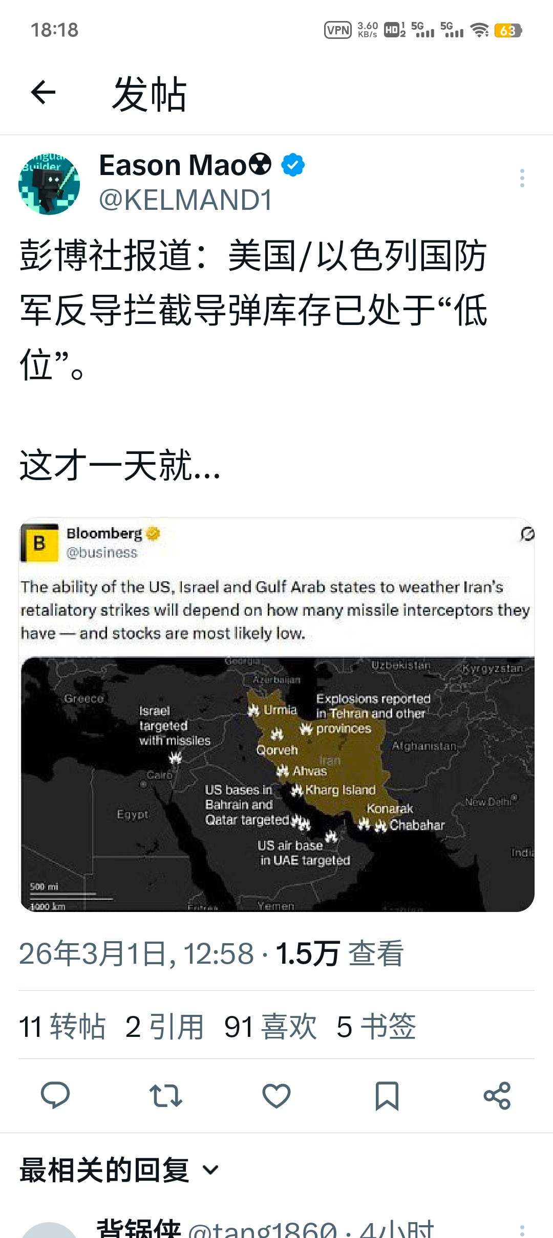 提款机 2 2026-03-01 21:57 集束子母汽油弹,小摩托,高超音速导弹,反舰导弹齐射打航母。一招,重新激活“抵抗之弧”,多点开花缠死对手。北线黎巴嫩真主党,数千枚火箭弹覆盖以色列全境,压垮“铁穹”; 红海方向,也门胡塞武装封锁航运、袭击美以关联船只。东线伊拉克或者叙利亚民兵袭扰美军基地。二招,用无人机低成本持续饱和打击,耗空以色列反导系统,再用高超音速导弹突防。三招,先发制人,出动地面部队进入以色列,打他个措手不及。