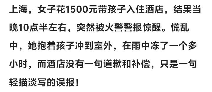 上海外滩天价酒店惊魂夜!1500元换来雨夜狂奔无人管,母亲抱娃寒风中颤抖一小时仅获冷血“误报”二字! 那一晚的上海外滩,寒风刺骨,冷雨如冰。一位母亲紧紧搂着怀中瑟瑟发抖的幼子,站在午夜的街头,单薄的睡衣早已湿透。她们身后,那栋灯火辉煌的高级酒店,沉默得像一座冰山。这不是电影场景,这是一位消费者用1500元买来的真实噩梦。 从美梦到噩梦,只需要一阵尖锐的警报声。当“着火”的喊声与警报撕裂夜空,所有关于品质与安全的幻想瞬间破灭。走廊里尽是仓皇失措的身影,孩子惊恐的哭声淹没在混乱的脚步声中。那位母亲,只能凭借本能,抓起一件小衣,赤着脚抱起孩子就冲进漆黑的逃生通道。 真正的绝望,从奔逃到街头才开始。冰冷的雨水瞬间打透衣衫,寒风像刀子一样刮过皮肤。几十名住客,男女老少,如同难民般在雨夜里蜷缩。他们四处张望,期盼着那理应出现的橙色制服,哪怕只是一句安抚,一条毛毯。然而,什么都没有。酒店的大门仿佛一道结界,将服务与责任牢牢锁在温暖的室内。 时间在寒冷中一分一秒地凝固。拨打前台电话,只有空洞的忙音在回应。那一刻,他们不是尊贵的客人,而是被系统彻底遗忘的弃子。高昂的房费买来的“尊贵体验”,在危机面前露出了最讽刺的底色:原来所谓的高端,可以如此冰冷,如此漠然。 一小时后,一句轻描淡写的“误报,可以回了”为这场折磨画上句点。回到大堂,身心俱疲的客人们面对的是员工事不关己的冷漠面孔。没有解释,没有关怀,更没有歉意。所有的质问都被“不知情”、“领导不在”的盾牌挡回。那种傲慢,比室外的严寒更让人心颤。 这场闹剧最可怕的,并非技术误报,而是整个服务体系在关键时刻的集体“宕机”。从疏散引导的缺失,到应急物资的空白,再到事后沟通的傲慢,每一步都踩碎了消费者最基本的信任。它赤裸裸地揭示:某些标榜高端的场所,其光鲜亮丽的袍子下,可能爬满了“应付”与“麻木”的虱子。 顾客的愤怒,从来不只是为了那一晚的风寒。而是痛心于用真金白银换来的,竟是如此不堪一击的安全承诺。当一家酒店连最基本的人文关怀与应急责任都丧失,它卖的已不是服务,而是一场以金钱为赌注的冒险。这记警钟,该敲醒所有麻木的神经。 酒店安全惊魂 服务冷漠何时休