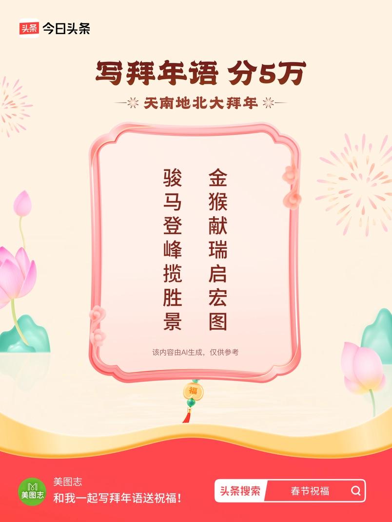 写拜年语送祝福新春拜年送祝福!我的祝福是:“骏马登峰揽胜景,金猴献瑞启宏图”!快来一起写祝福吧戳这里,一起领红包>