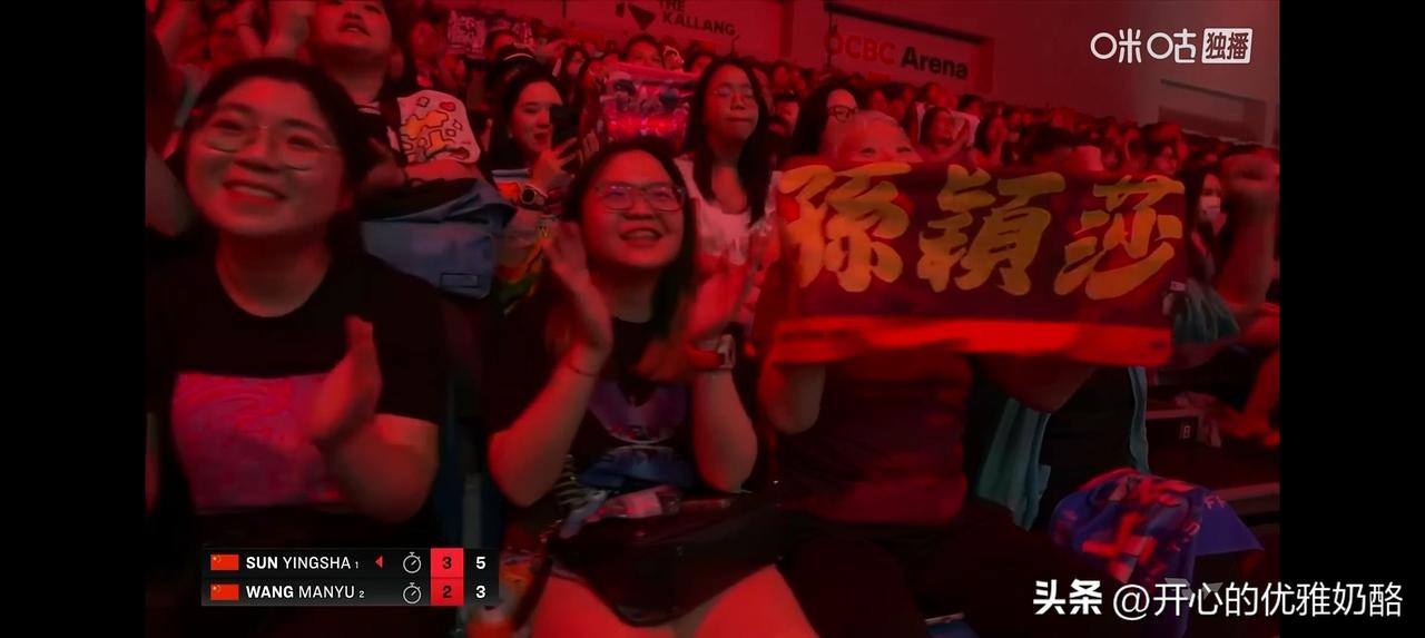 莎莎女单夺冠,现场粉丝太给力。 莎莎每得一分,现场的粉丝都激动大喊,莎莎赢了也是先向看台粉丝致意。 今天赛前问了豆包,女单冠军是谁,豆包说是莎莎,但比分预测错了4-3,莎莎只打六局就锁定胜利。 莎莎开年连获两场大赛女单冠军,世一不是白给的,当前女队还是最稳定的,曼昱一路过关斩将,和莎莎会师总决赛,也是虽败犹荣。 加油中国队,恭喜女单夺冠。 图片来自网络侵权可删。