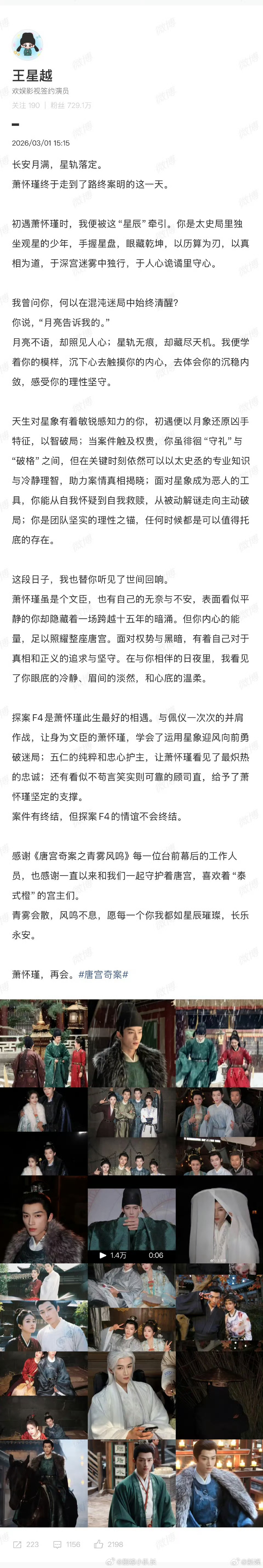王星越长文告别萧怀瑾王星越发长文告别萧怀瑾 读王星越的文字总能感受到真诚,他把萧怀瑾的喜怒哀乐都揉进自己身体里,收官时刻字字句句都是掏心窝子的话。好角色遇到好演员,是双向的幸运。