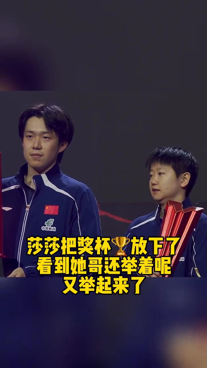 王楚钦获得男单冠军,再次捍卫国乒荣耀。 小林获得男单亚军,场上是对手,场下是朋友。大头招呼小林往这边站。男女单打冠军合影环节,看到莎头同框啦,小嘴叭叭讲个不停。莎莎把奖杯放下了,看到她哥还举着,又举起来了。这就是冠军的烦恼吗?莎头合影。