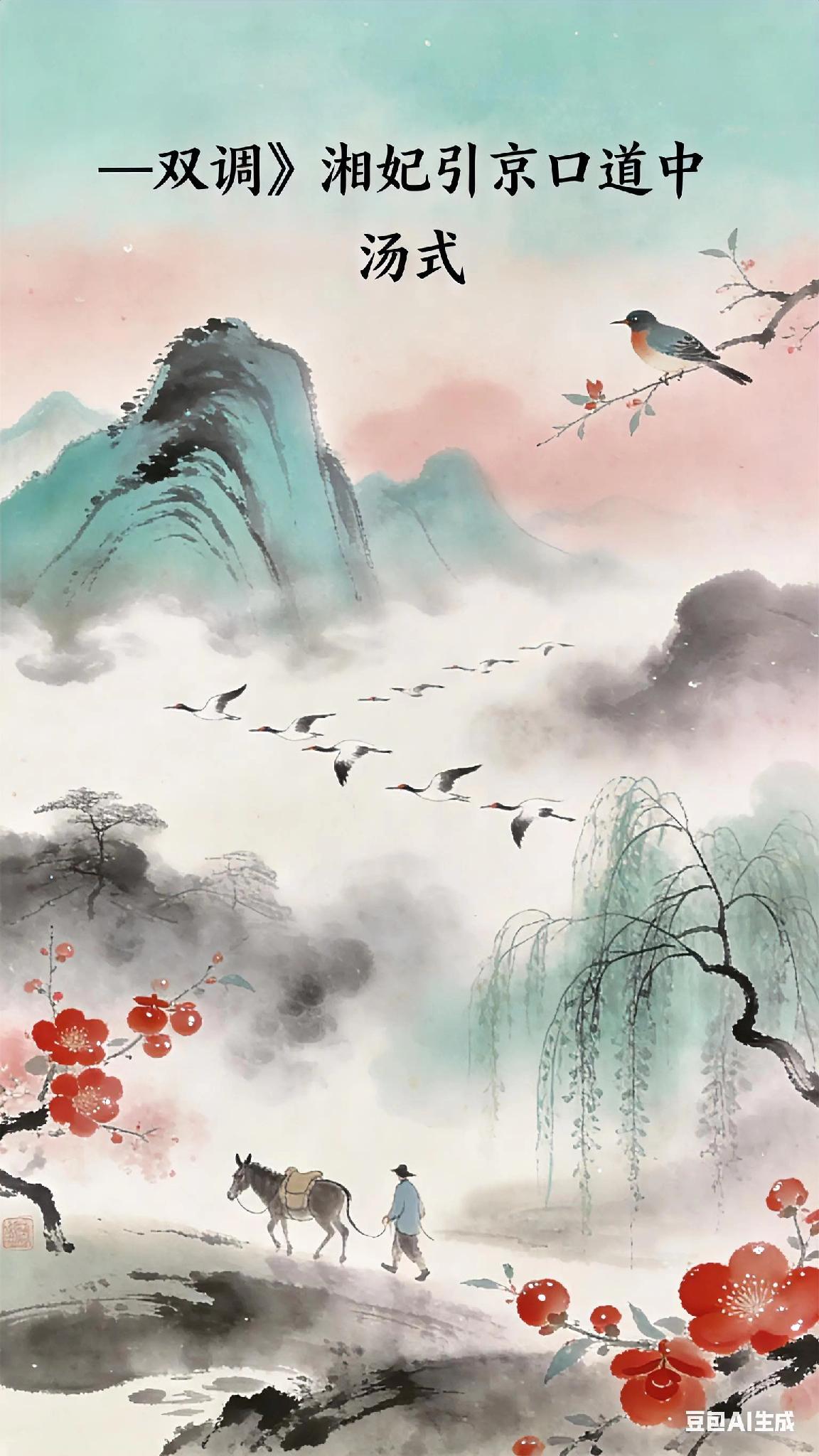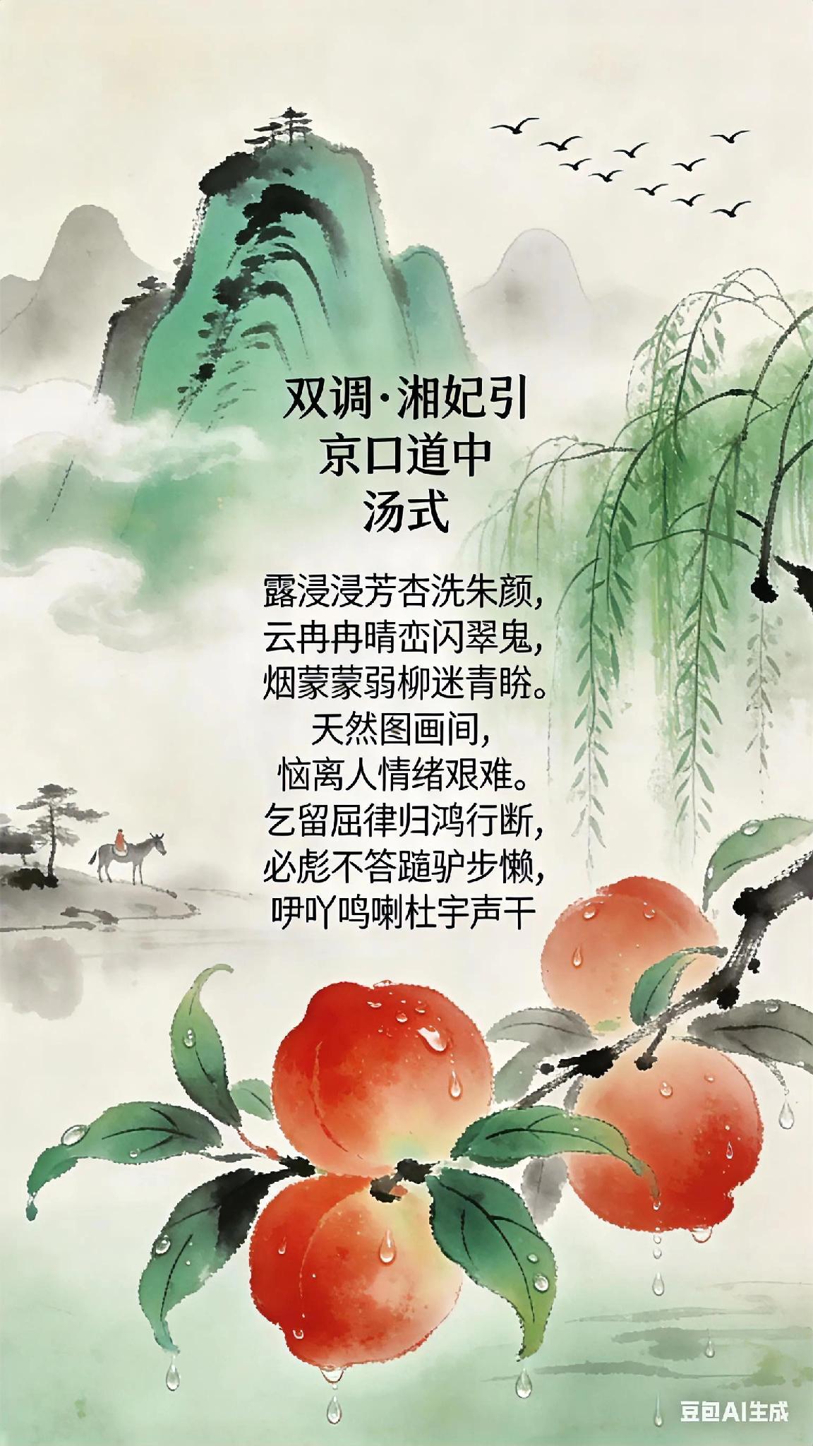 《双调》湘妃引京口道中、汤式 露浸浸芳杏洗朱颜, 云冉冉晴峦闪翠鬟, 烟蒙蒙弱柳迷青眄。 天然图画间, 恼离人情绪艰难。 乞留屈律归鸿行断, 必彪不答蹇驴步懒, 咿呖呜喇杜宇声干。 《京口道中》现译: 露水浸润着盛开的杏花,洗去它红艳的容颜, 薄云缓缓飘过晴空下的山峦,仿佛闪动着青翠的发髻, 朦胧的烟雾笼罩着柔弱的柳枝,迷离了游人的目光。 这天然的画卷虽美,却让离乡之人更觉愁绪难解。 天边,归雁排着歪斜的队形断续南飞, 路上,疲惫的驴子懒散地踱着步子, 耳边,杜鹃鸟的啼声嘶哑干涩,更添几分凄凉。 古诗词 你记得最深的一首古诗词是什么 你最喜欢的一句古诗词是什么 鹧鸪天·宴间意 鹧鸪天·寄远 五律泛朱张渡 西江月茶词 七律雅韵 临江仙雅韵 雅韵诗文