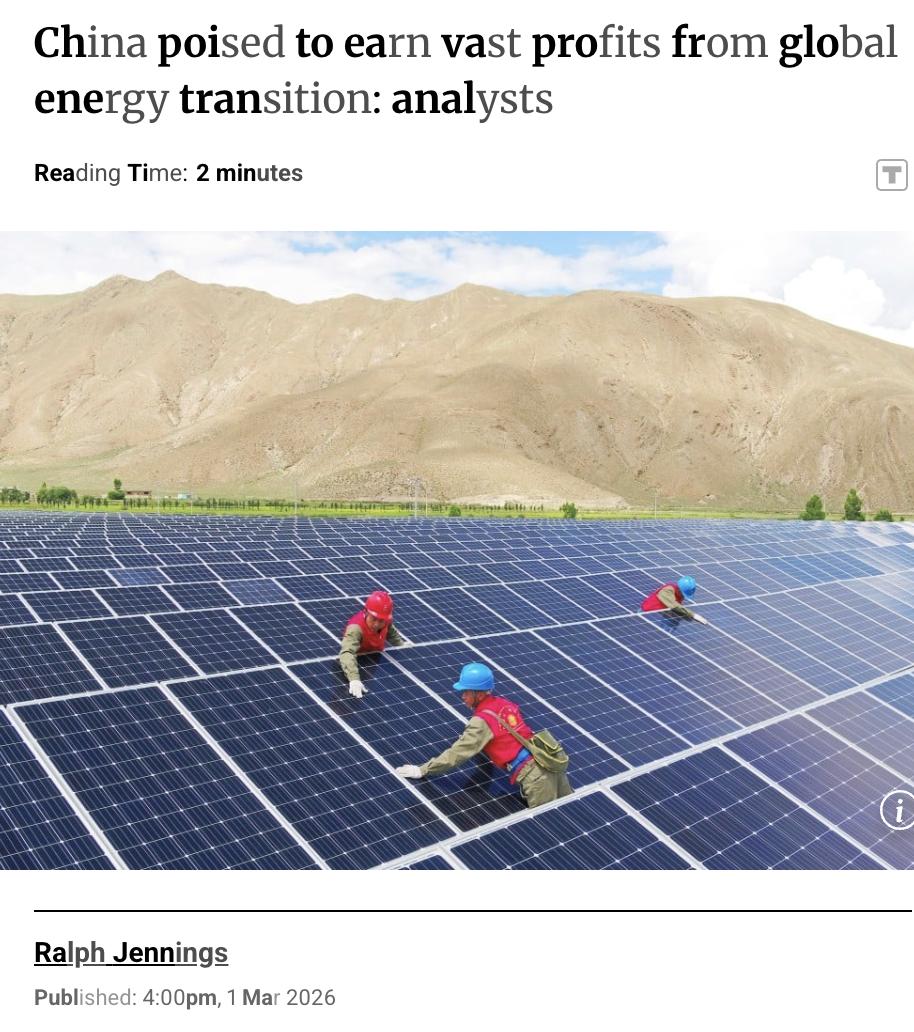 外媒:随着全球清洁能源基础设施投资浪潮的到来,中国企业凭借无可匹敌的规模和成本优势,已占据最有利的竞争位置。 分析人士指出,中国在风能、太阳能、电动汽车及电池领域积累了大量国内市场经验和技术实力,正是其他国家摆脱煤电和燃油车依赖所迫切需要的。 未来数十年全球将在新基础设施上投入数十亿乃至数万亿美元以应对气候变化,中国企业的获利潜力巨大。 G20全球基础设施中心2017年估计,到2040年全球需要94万亿美元的基础设施投资以支撑经济增长。