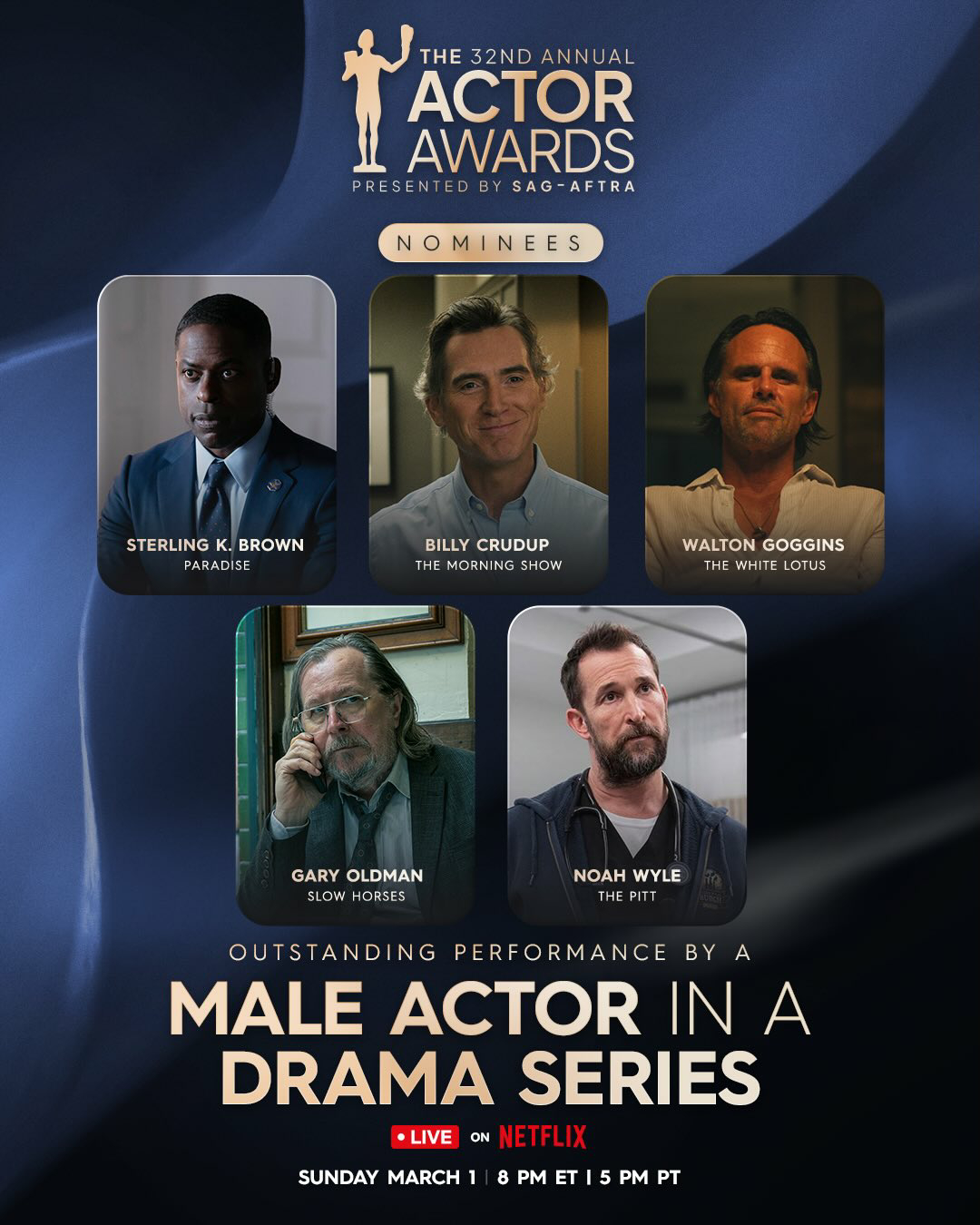 剧情类剧集最佳男演员:Sterling K. Brown《极乐凶间》Billy Crudup《早间新闻》Walton Goggins《白莲花度假村》加里奥德曼《流人》诺亚怀尔《匹兹堡医护前线》
