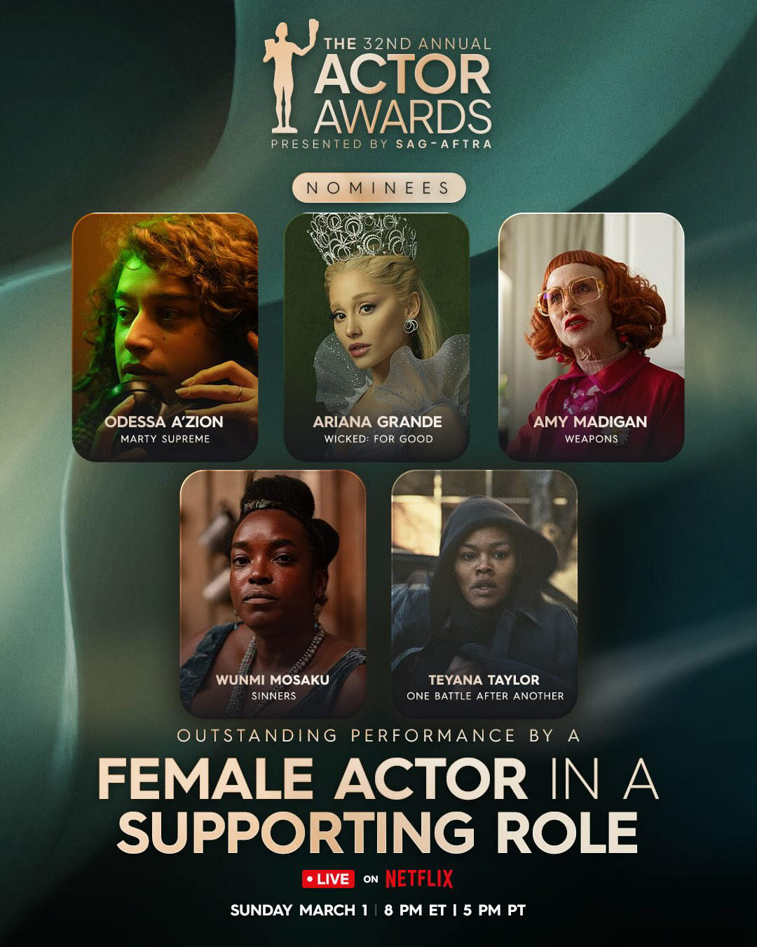 最佳女配角:Odessa A/zion《至尊马蒂》Ariana Grande《魔法坏女巫2》Amy Madigan《凶器》乌米·马萨库《罪人》Teyana Taylor《一战再战》