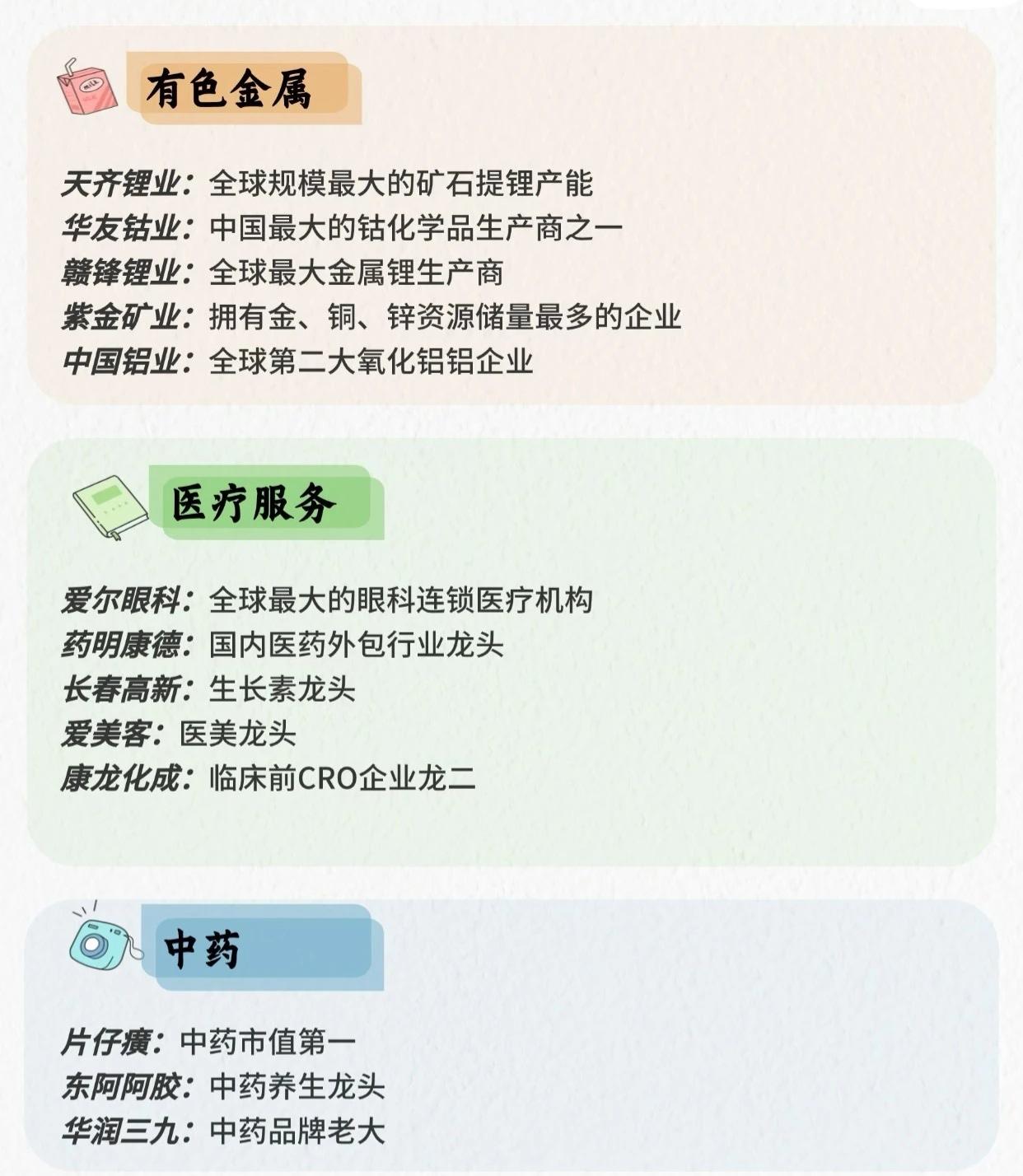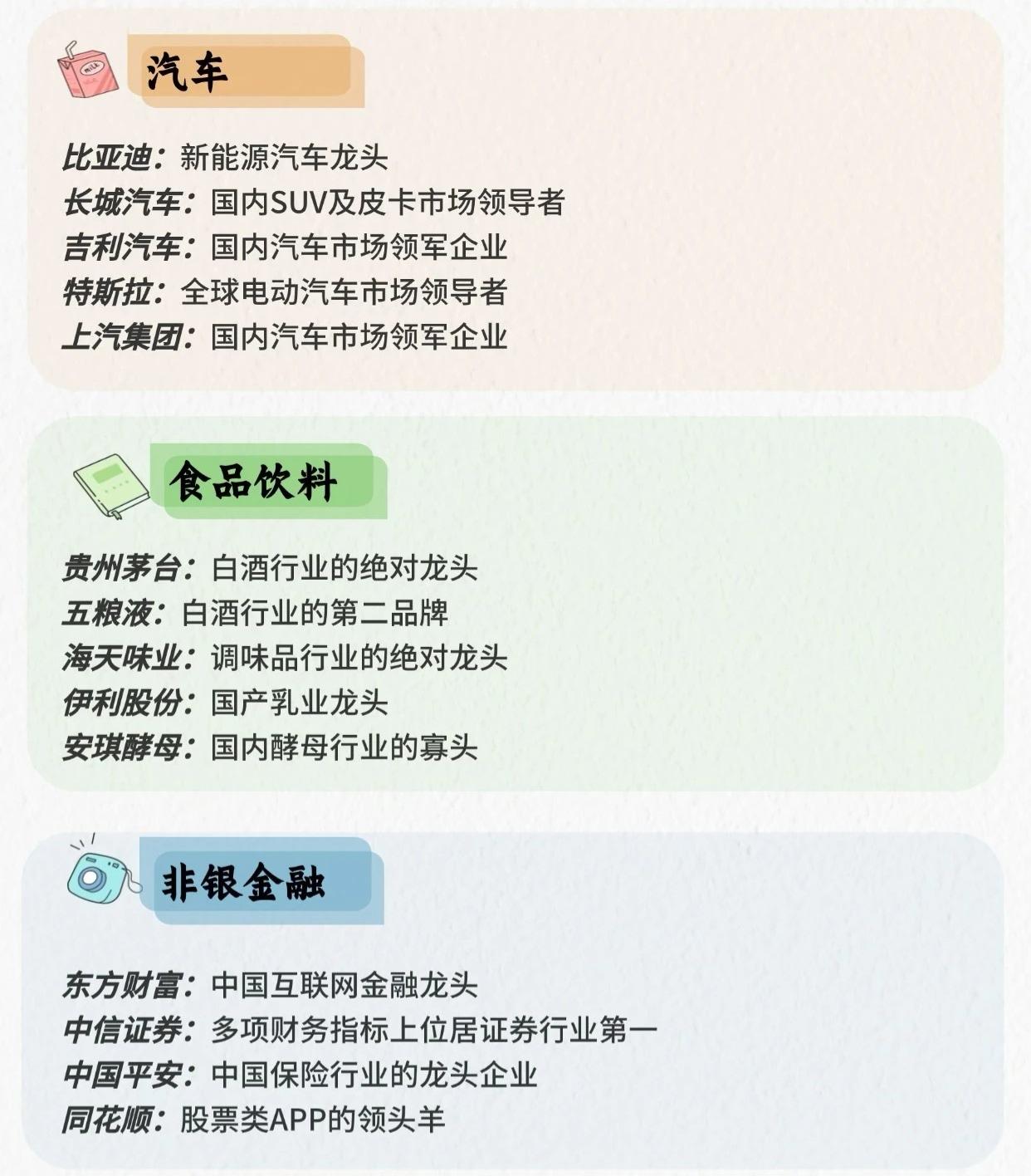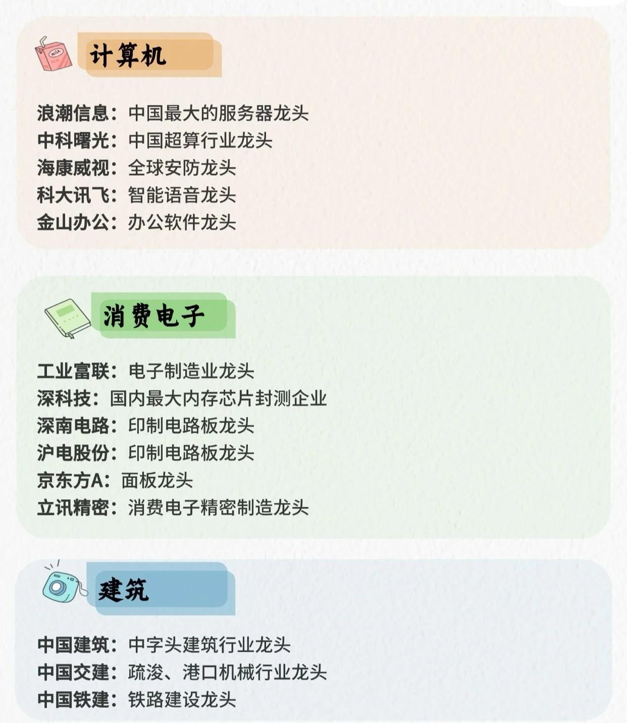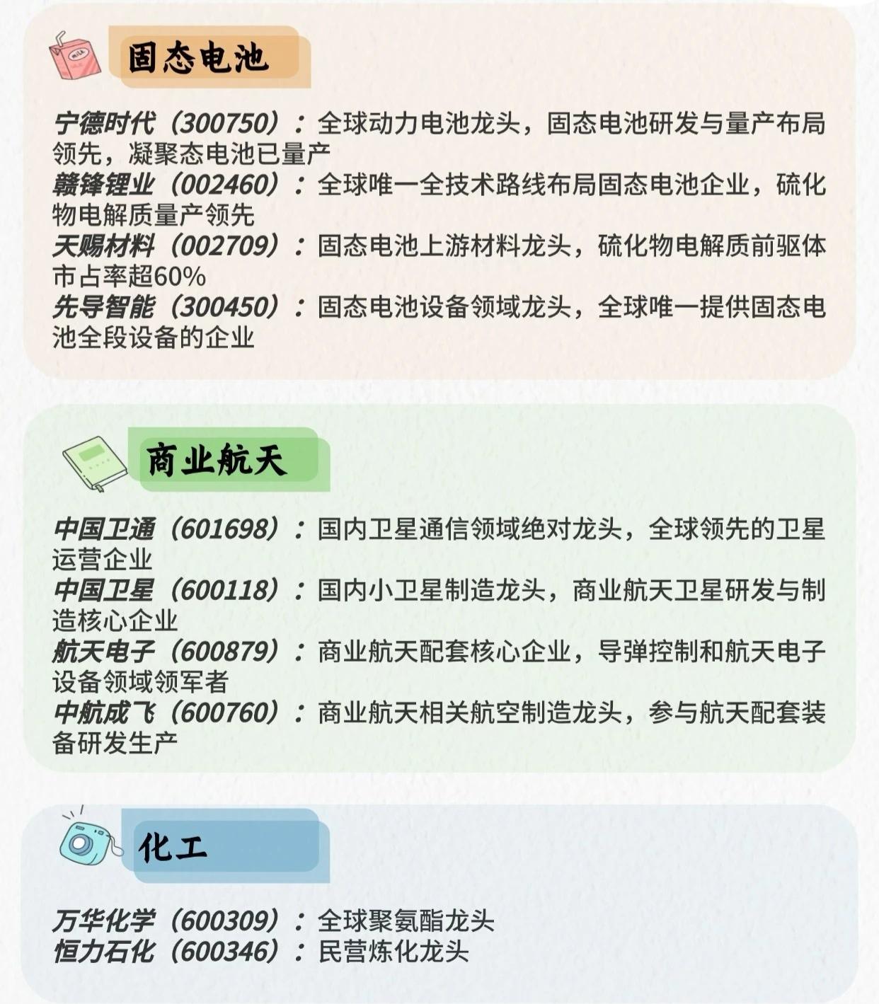 行业龙头信息整理成一个简洁总表,方便快速查看: 一、AI应用 - 科大讯飞(002230):智能语音AI应用龙头,深耕教育、医疗等场景 - 海康威视(002415):AI安防应用绝对龙头,智能监控与物联网AI方案领军者 - 工业富联(601138):工业AI应用龙头,AI+智能制造与算力基础设施核心企业 - 寒武纪(688256):AI芯片与智能应用龙头,聚焦云端、边缘端AI算力支撑 - 金山办公(688111):AI+办公应用龙头,智能编辑、AI协作功能引领行业 二、人形机器人 - 蓝思科技(300433):整机组装与核心部件龙头,具备规模化量产能力 - 汇川技术(300124):核心部件领军者,电机、驱动器供应头部企业 - 绿的谐波(688017):谐波减速器龙头,精密传动解决方案核心供应商 - 三花智控(002050):执行器与热管理部件龙头,深度绑定头部机器人企业 三、商业航天 - 中国卫通(601698):国内卫星通信绝对龙头,全球领先卫星运营企业 - 中国卫星(600118):国内小卫星制造龙头,商业航天卫星研发制造核心企业 - 航天电子(600879):商业航天配套核心企业,导弹控制与航天电子设备领军者 - 中航成飞(600760):商业航天相关航空制造龙头,参与航天配套装备研发生产 四、固态电池 - 宁德时代(300750):全球动力电池龙头,固态电池研发与量产布局领先,凝聚态电池已量产 - 赣锋锂业(002460):全球唯一全技术路线布局固态电池企业,硫化物电解质量产领先 - 天赐材料(002709):固态电池上游材料龙头,硫化物电解质前驱体市占率超60% - 先导智能(300450):固态电池设备领域龙头,全球唯一提供固态电池全段设备的企业 五、化工 - 万华化学(600309):全球聚氨酯龙头 - 恒力石化(600346):民营炼化龙头 六、建筑 - 中国建筑:中字头建筑行业龙头 - 中国交建:疏浚、港口机械行业龙头 - 中国铁建:铁路建设龙头 七、非银金融 - 东方财富:中国互联网金融龙头 - 中信证券:多项财务指标居证券行业第一 - 中国平安:中国保险行业龙头企业 - 同花顺:股票类APP领头羊 八、汽车 - 比亚迪:新能源汽车龙头 - 长城汽车:国内SUV及皮卡市场领导者 - 吉利汽车:国内汽车市场领军企业 - 特斯拉:全球电动汽车市场领导者 - 上汽集团:国内汽车市场领军企业 九、食品饮料 - 贵州茅台:白酒行业绝对龙头 - 五粮液:白酒行业第二品牌 - 海天味业:调味品行业绝对龙头 - 伊利股份:国产乳业龙头 - 安琪酵母:国内酵母行业寡头 十、有色金属 - 天齐锂业:全球规模最大矿石提锂产能 - 华友钴业:中国最大钴化学品生产商之一 - 赣锋锂业:全球最大金属锂生产商 - 紫金矿业:金、铜、锌资源储量最多企业 - 中国铝业:全球第二大氧化铝企业 十一、医疗服务 - 爱尔眼科:全球最大眼科连锁医疗机构 - 药明康德:国内医药外包行业龙头 - 长春高新:生长素龙头 - 爱美客:医美龙头 - 康龙化成:临床前CRO企业龙二 十二、中药 - 片仔癀:中药市值第一 - 东阿阿胶:中药养生龙头 - 华润三九:中药品牌老大