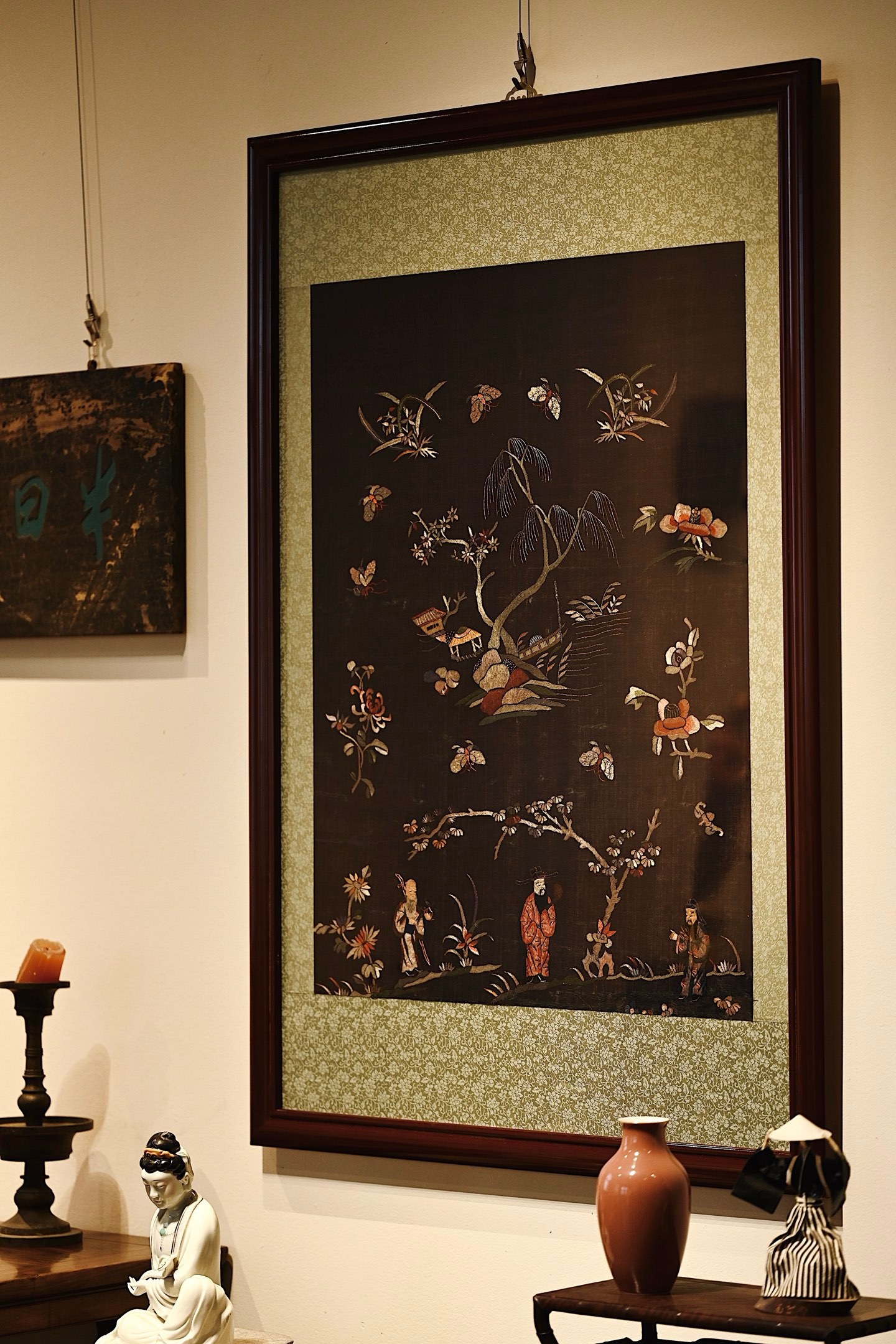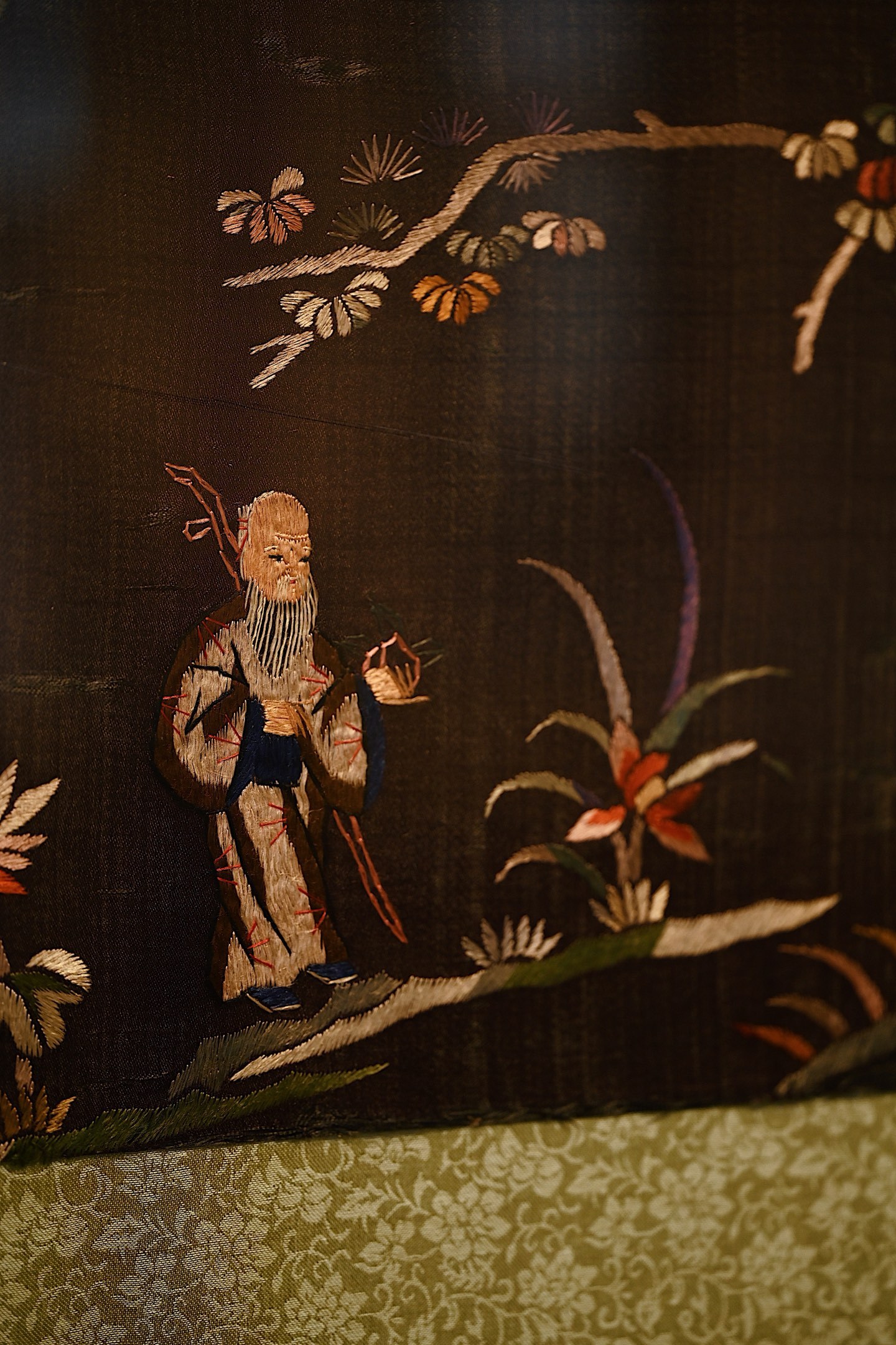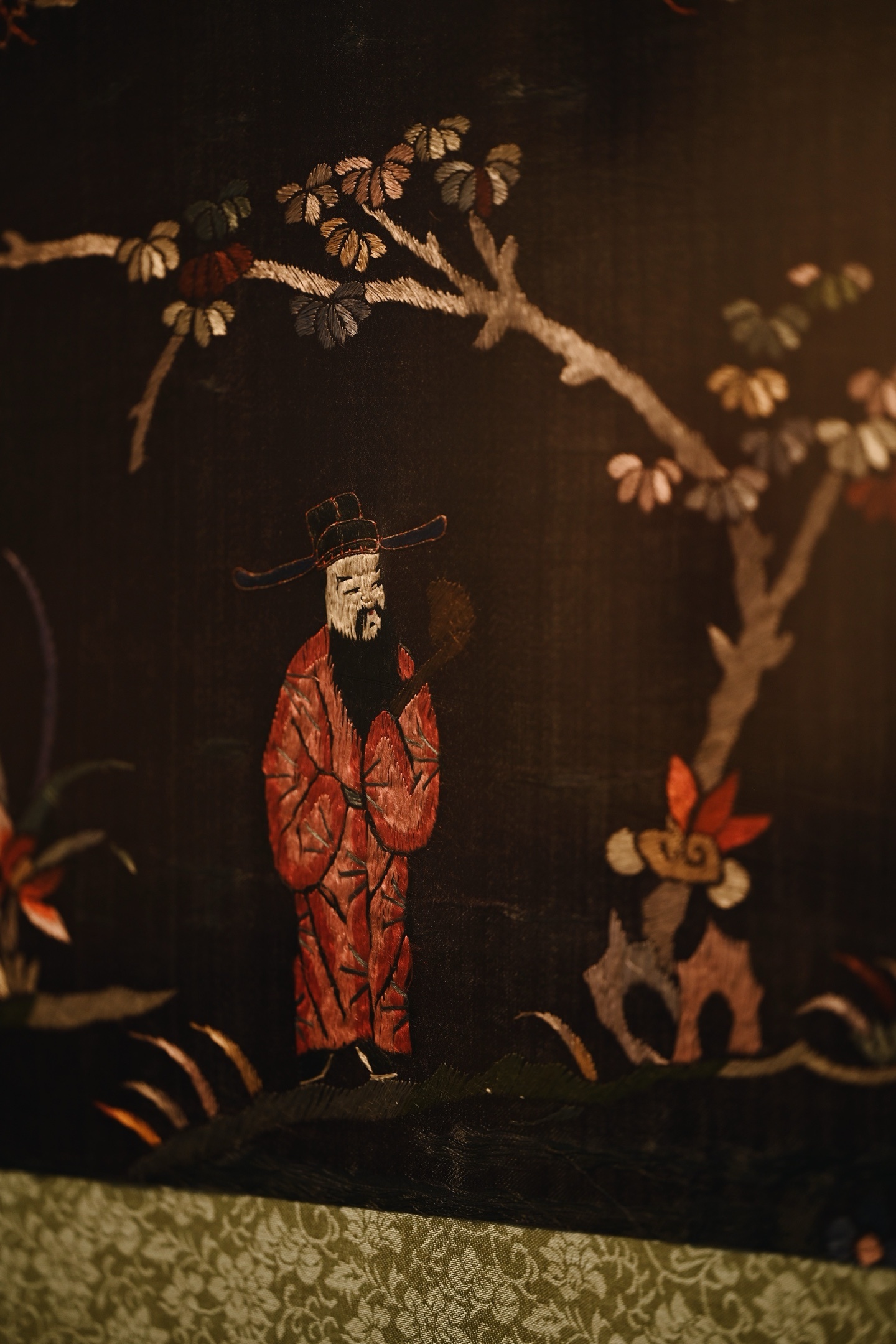 大致为清末民国初期之物,绣面保存较为完整,画面中“福禄寿”三星眉目慈善,长髯飘逸,或捧寿桃或执如意,形象生动,又有各式花卉点缀画面,配色雅致,装点客厅、茶室等,极富中式古典韵味。