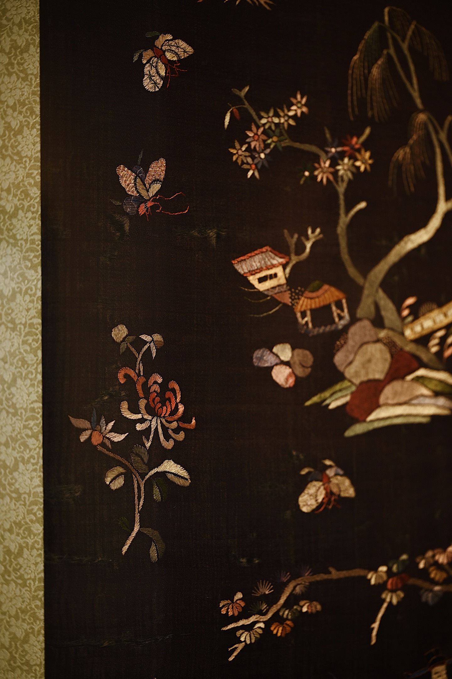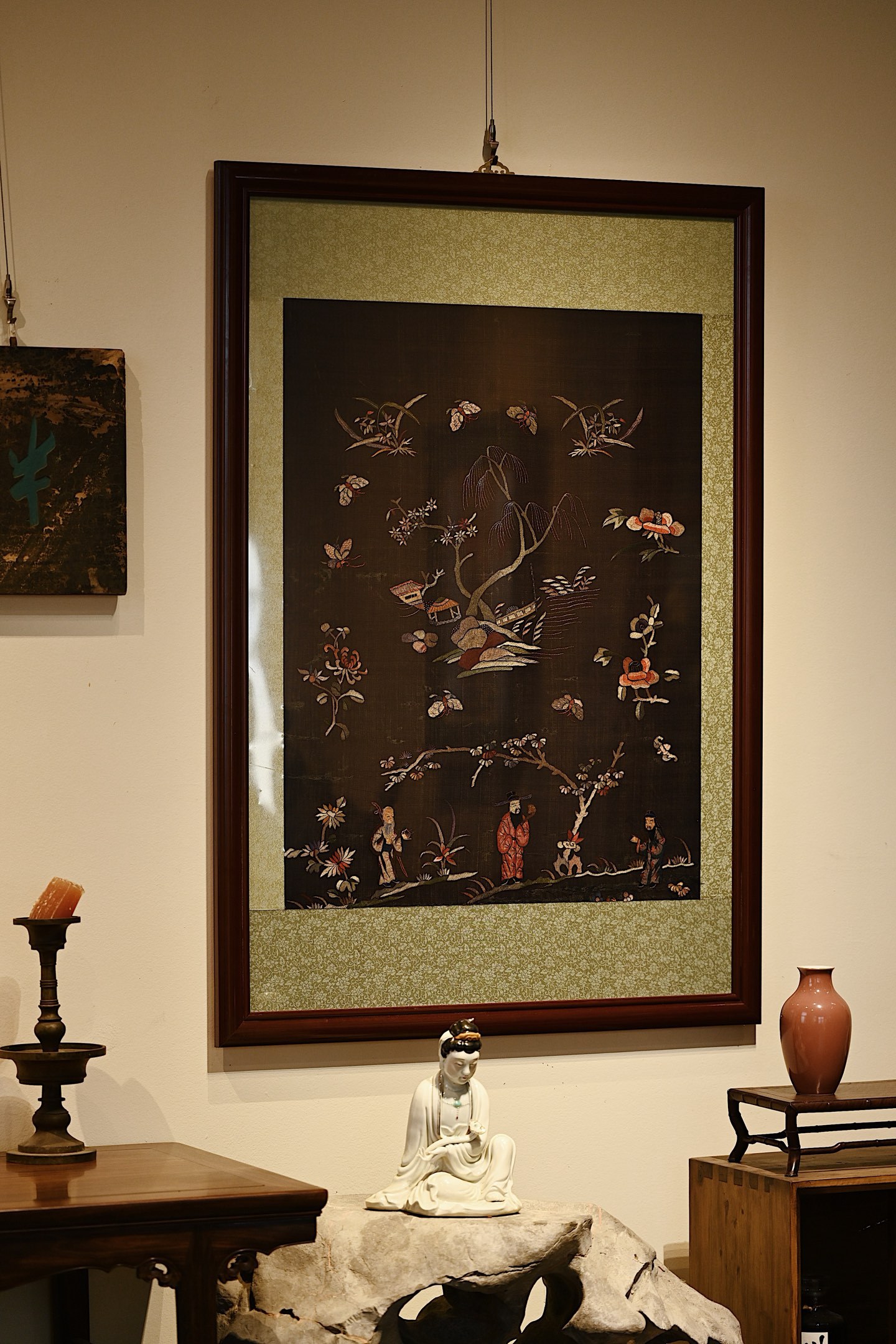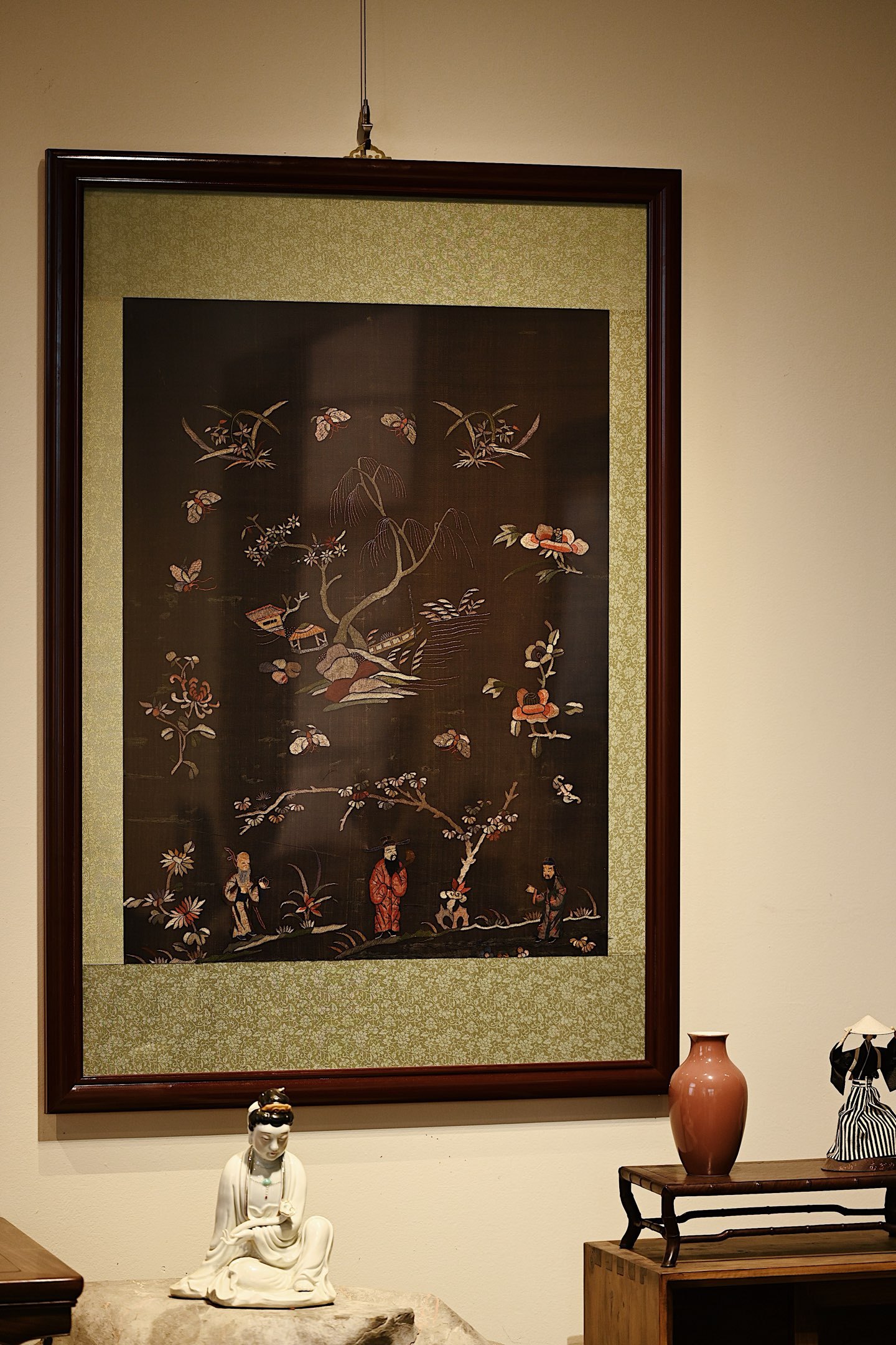 大致为清末民国初期之物,绣面保存较为完整,画面中“福禄寿”三星眉目慈善,长髯飘逸,或捧寿桃或执如意,形象生动,又有各式花卉点缀画面,配色雅致,装点客厅、茶室等,极富中式古典韵味。