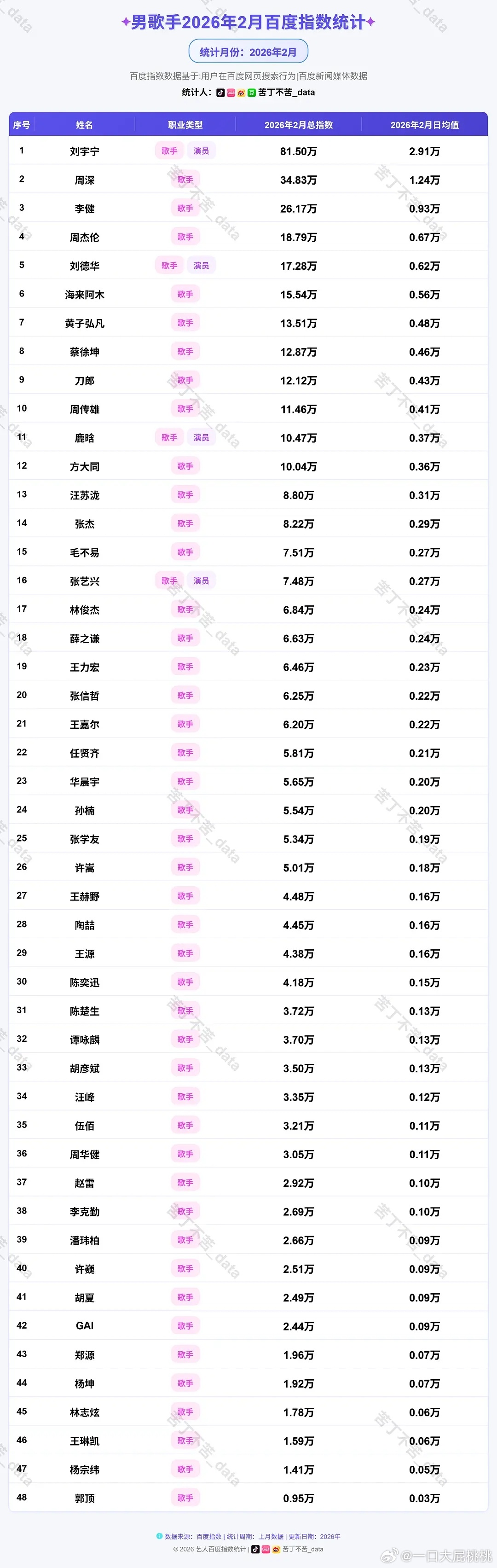 男女歌手2月百指统计~男刘宇宁,女王菲