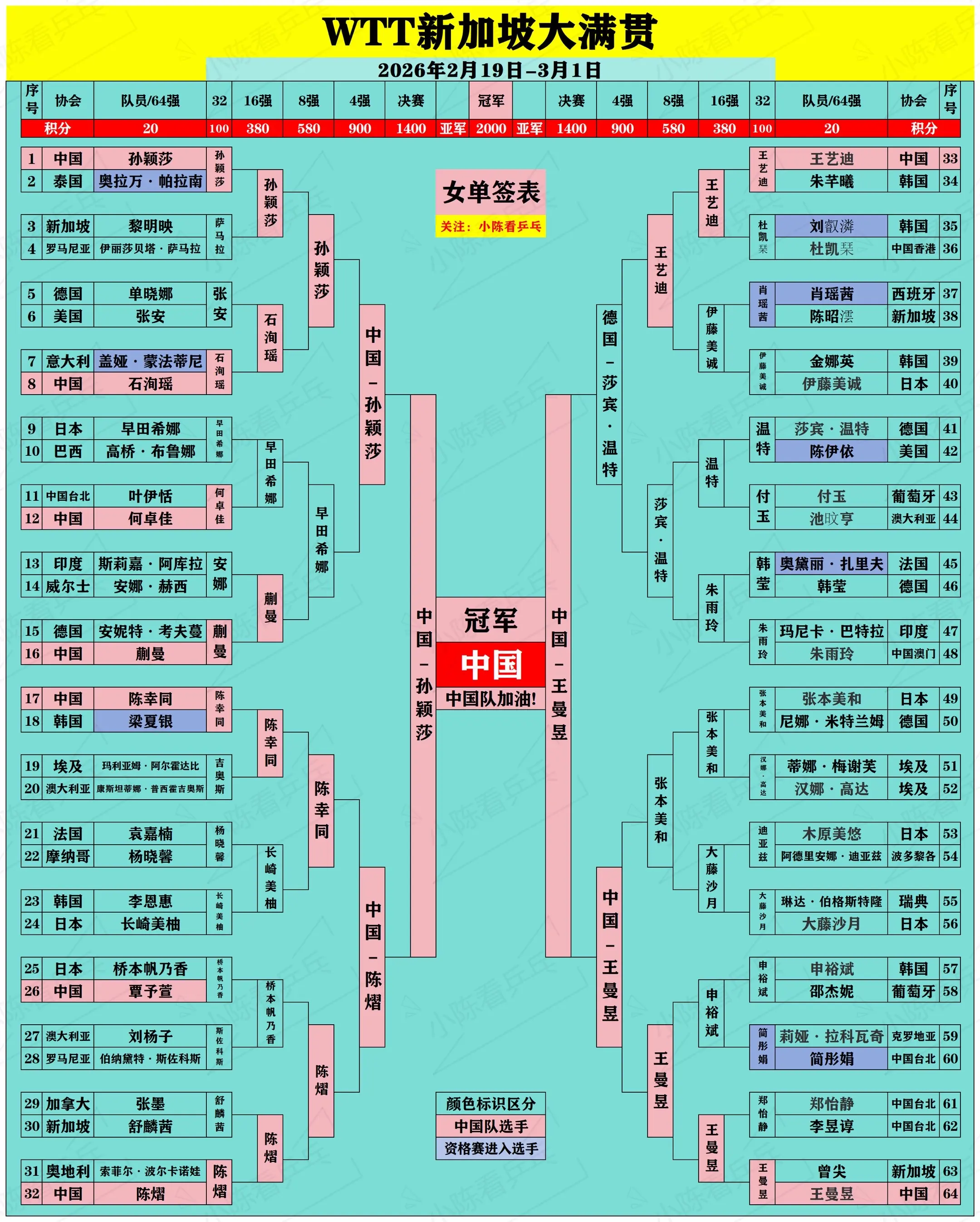 WTT新加坡大满贯签位图更新国乒继续加油。男女单打16强全部出炉,女单...