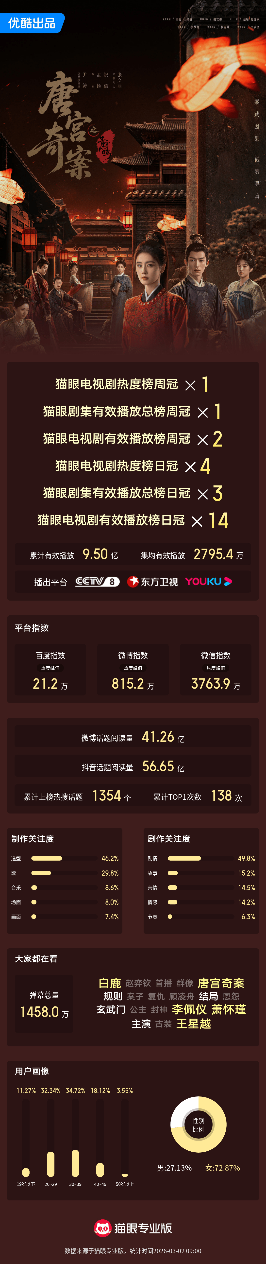 唐宫奇案电视剧有效播放14次登顶收官 “你以为,你站在世间的规则之上,那我就来你的规则里。”据猫眼专业版数据,领衔主演电视剧《唐宫奇案之青雾风鸣》已收官,截至目前累计有效播放量超9.5亿、集均有效播放量超2795.4万。你追剧了吗?来一起盘点收官成就吧~-猫眼电视剧热度榜周冠*1-猫眼剧集有效播放总榜周冠*1-猫眼电视剧有效播放榜周冠*2-猫眼电视剧热度榜日冠*4-猫眼剧集有效播放总榜日冠*3-猫眼电视剧有效播放榜日冠*14