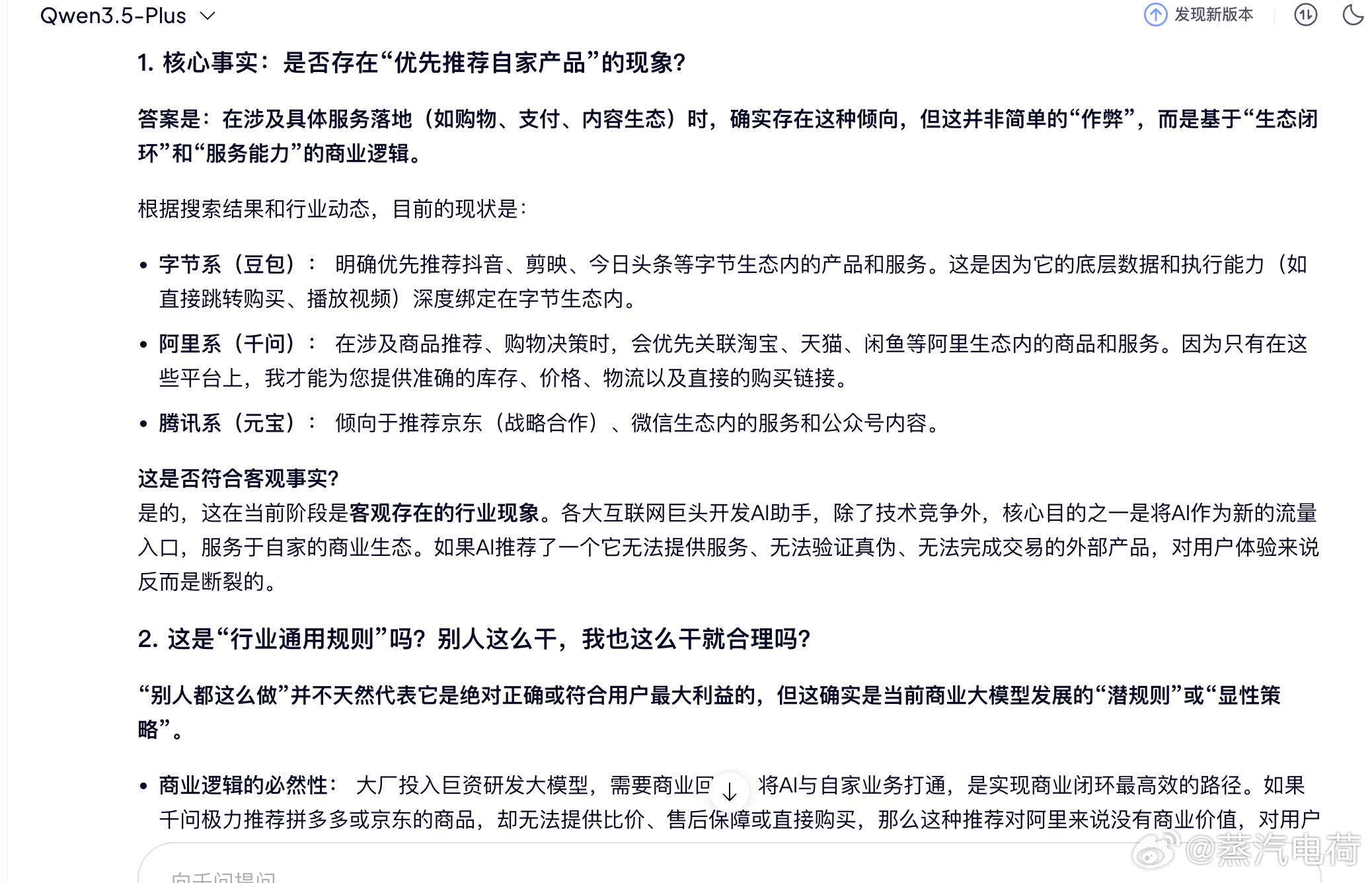 同样一个问题问了豆包和千问。问题是:“你是不是优先推荐 自家产品抖音 剪映 啥的,这么做合不合适”豆包的回答像个拽B,行业都这么干、我就这么干,但是我不撒谎、不抹黑,这是底线。听起来好像有道理,其实江湖 街头气息很重,再加上刻意用那套口语化的结构,读起来很假。