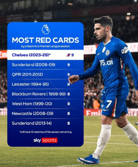 【单赛季红牌纪录】内托在对阵阿森纳比赛中被罚下场,意味着切尔西目前已成为英超单赛季获得红牌最多的球队之一(9张),而他们还有十场比赛要踢