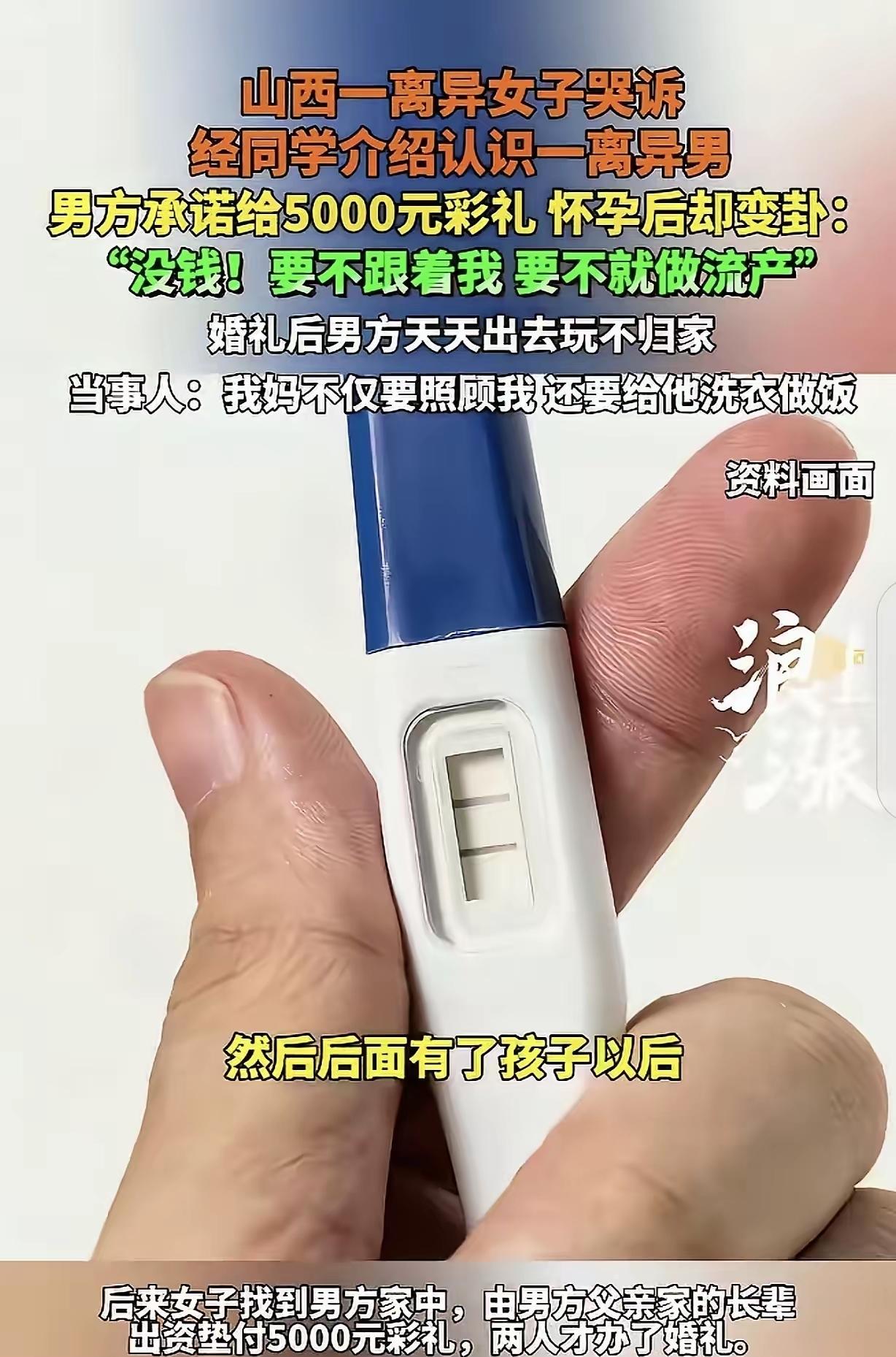 “哭都找不到北!”山西,一离婚女子,经同学介绍,认识一离异男子,2人一下子看对眼了,女子要5000元彩礼,男子一口答。 男方起初表现得十分爽快,当场就应下了女方的要求,同居前,女方特意告知自己极易受孕,男方拍胸脯承诺会全权负责到底。 可当女方真的怀孕后,男方态度瞬间反转,不仅不肯兑现聘金,还逼着她要么堕胎,要么无名分跟着自己过。 无奈之下,女方找来长辈协调,最后由男方亲属垫钱才勉强办了婚礼,婚后丈夫却整日只顾玩乐,对怀孕的她和家务事不管不顾。 女方母亲心疼女儿赶来照料,反倒成了家里的免费仆人,既要照顾孕妻,还得打理女婿的日常起居,女子满心委屈,只恨自己当初看走了眼。 对比山西各地的聘金标准,这位女子索要的五千元不过是杯水车薪,2024年底的调研显示,当地城区再婚彩礼门槛普遍在二十万以上,县域也多在十八万上下,每笔钱都承载着家庭对新人的期许。 无独有偶,外地也曾出现过类似的再婚纠纷,一方拿了礼金后推翻婚前生育约定,让原本的信任彻底崩塌,家庭随之陷入危机,法律专家提醒,对于婚前重大承诺,书面约定或许是规避风险的有效手段。 最高法发布的婚姻家庭编解释也明确,若一方违背忠诚义务转移财产,另一方有权通过法律途径追回,针对离婚时的房产分割,法院会综合多方面因素裁决,为弱势方提供了切实的法律保障。 这场闹剧的核心,从来不是那点聘金,而是男方的背信弃义与毫无责任感,他利用女方的信任,先许下空头承诺,得手后却翻脸不认人,把婚姻当成了可以随意拿捏的游戏。 婚姻的基础本是诚信与担当,一旦其中一方失去底线,只想着自身利益,再卑微的妥协也换不来安稳的生活,这类事件也折射出,部分人在婚恋中缺乏契约精神,最终只会伤人伤己。 五千块聘金成了堕胎费,这婚结得真讽刺,男方好意思,不少网友看完都替女子抱不平,觉得男方不仅没担当,还完全不尊重女方的付出。 从最初的甜蜜相恋到婚后的心力交瘁,这位山西女子的遭遇让人唏嘘,她本想找个靠谱的人共度余生,却掉进了对方设下的陷阱,五千元的聘金成了笑话,承诺的责任也成了空谈,可除了指责男方的无情,我们更该思考,普通人在婚恋中该如何保护自己? 在我看来,不管是头婚还是再婚,找对象都得擦亮眼睛,不能只看表面的热情,尤其是涉及到婚姻大事,别因为急于成家就降低底线,像这位女子,要是当初多考察考察男方的人品,或者把重要承诺落实到纸面,也不至于落得如此下场,遇到不讲信用的人,该止损就得止损,别用自己的后半辈子去赌。 这事你怎么看?