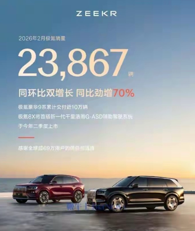 极氪汽车2026年全年销量目标是30万辆。2026年开年,极氪汽车就保持着强劲的增长势头,市场表现亮眼。1月销量达到23852辆,2月销量达到23867辆。