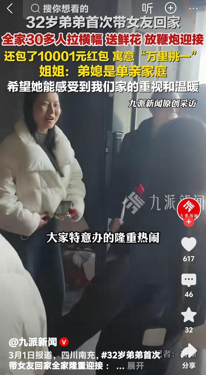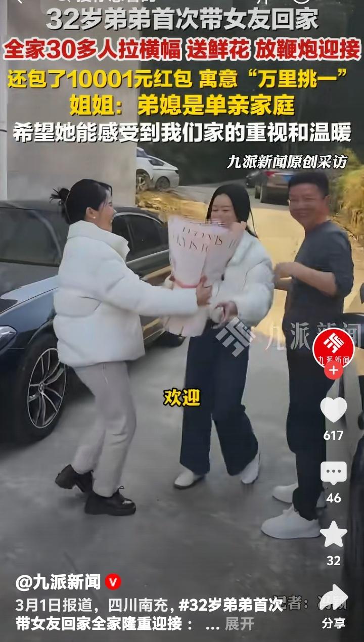四川南充震撼一幕!32岁男子携女友归家,全家三十多人出动横幅鲜花鞭炮齐鸣,万里挑一红包背后藏泪目真相:我们要给你一个家! 车刚拐进村口,震耳的鞭炮声就炸响了。三十多口人黑压压挤在院门前,鲜红横幅拉得老长——“热烈欢迎沈熠首次回家”。女孩捧着那束几乎抱不住的鲜花,手里被塞进厚厚红包:10001元,万里挑一。她咬着嘴唇,眼泪却先笑了出来。 这哪是见家长?分明是全家总动员的“抢人”现场。姐姐后来坦言:“知道弟媳是单亲家庭,我们就想让她踏进门槛第一秒就明白——从此你也有家了。”原来,隆重从来不是秀给外人看的排场,而是把心掏出来的笨拙真诚。 想起另一个故事。有姑娘第一次去男友家,提着礼物站了半天,最后被安排到厨房吃剩菜。婆婆轻飘飘一句“我们这女人不上桌”,让她彻底心凉。对比眼前这幕——怕女孩怕狗,连夜把看门大黄送走;知道她要来,特意杀了年猪、摆了八桌。细节不会说谎。 为什么这段视频能一夜刷屏?或许是因为,在这个连婚姻都开始明码标价的时代,我们太久没见过这种“不讲道理”的好了。没有试探,没有计较,只有一股脑的“怕给得不够”。那种被坚定选择的感觉,才是安全感最原始的样貌。 女孩被簇拥着进屋时,有个细节很戳人。她悄悄拉了拉男友袖子,小声问:“这都是真的吗?”是啊,当真心成为稀缺品,连被爱都会让人受宠若惊。但爱情最美好的部分,不正是让一个人重新相信——我值得被这样隆重对待。 评论区里,有人羡慕,也有人黯然写下自己的故事。但更多声音在说:“这才是嫁人该有的样子。”其实仪式感背后,藏着一个家庭最根本的价值观:如何对待你的伴侣,就是如何对待你的后半生。这份尊重,比彩礼数字重要千万倍。 如今很多人在感情里精于计算,却忘了爱本质是“亏欠感”——总觉得自己给得不够。就像这家人,觉得横幅不够响,红包不够厚,鞭炮不够多。而真正好的婚姻,起点往往是这句:“你尽管来,剩下的交给我们。” 车开远了,鞭炮屑还没扫净。但那个攥着红包的女孩,心里应该已经种下一颗种子:这世界或许曾让你孤单,但总有人愿为你点亮一整座村庄。爱情最美的模样,从来不是风花雪月,而是你踏进陌生大门时,听见那句震耳欲聋的——“我们等你很久了”。 (来源:九派新闻原创采访) 家庭温暖 爱情仪式感