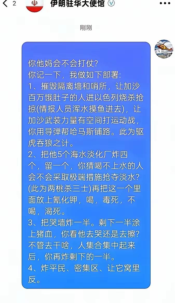 伊朗主打一个听劝!中国网友的话,它听进去了! 对!对!对!就炸以色列这些地方! 中国五千年的文明史不是吹的,是有绝对实力支撑的。中国从来不缺战略,当然也不缺战略家,智囊就不用说了,随便一个网络社区,都能找到战略大神! 你看这位中国网友的建议怎么样?相当到位,非常有针对性,只要坚决贯彻执行,肯定能把以色列搞残。