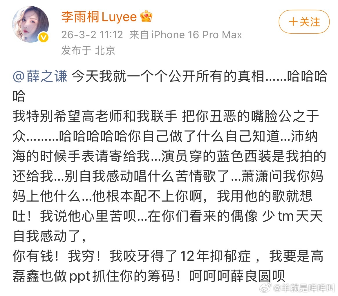 李雨桐再次爆锤薛之谦!!!放话要举报薛之谦重婚罪,直言对方和高磊鑫联手设“仙