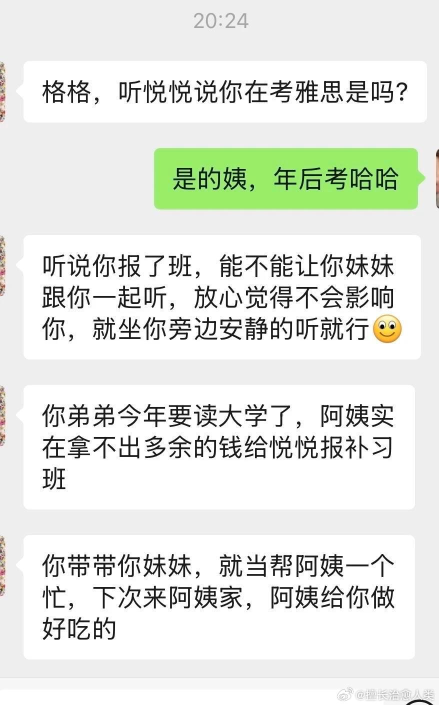 阿姨听说我在考雅思,还报了班,要我带我妹