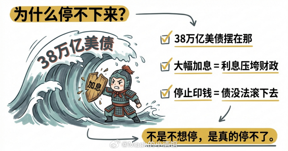 钱可以无限印,但实物没办法无限造。钱越来越多,实物就那么多,结果只有一个:实物越来越贵。这不是什么高深的经济学,就是最基础的常识。你去菜市场买菜,今天100块能买一篮子,明天100块只能买半篮子,不是菜变少了,是钱变毛了。石油和黄金也是一样的道理,只不过规模更大,影响更深远。那有人说,美国不是一直在加息吗?加息不就是为了把市场上多余的钱收回去吗?对,但问题是,收不回来了。38万亿的美债摆在那,每年光还利息就要花几万亿,你要大幅加息,利息直接压垮财政。你要停止印钱,债就没法滚下去。不是他们不想停,是真的停不了。你想想,如果能停,早就停了,还用等到现在?