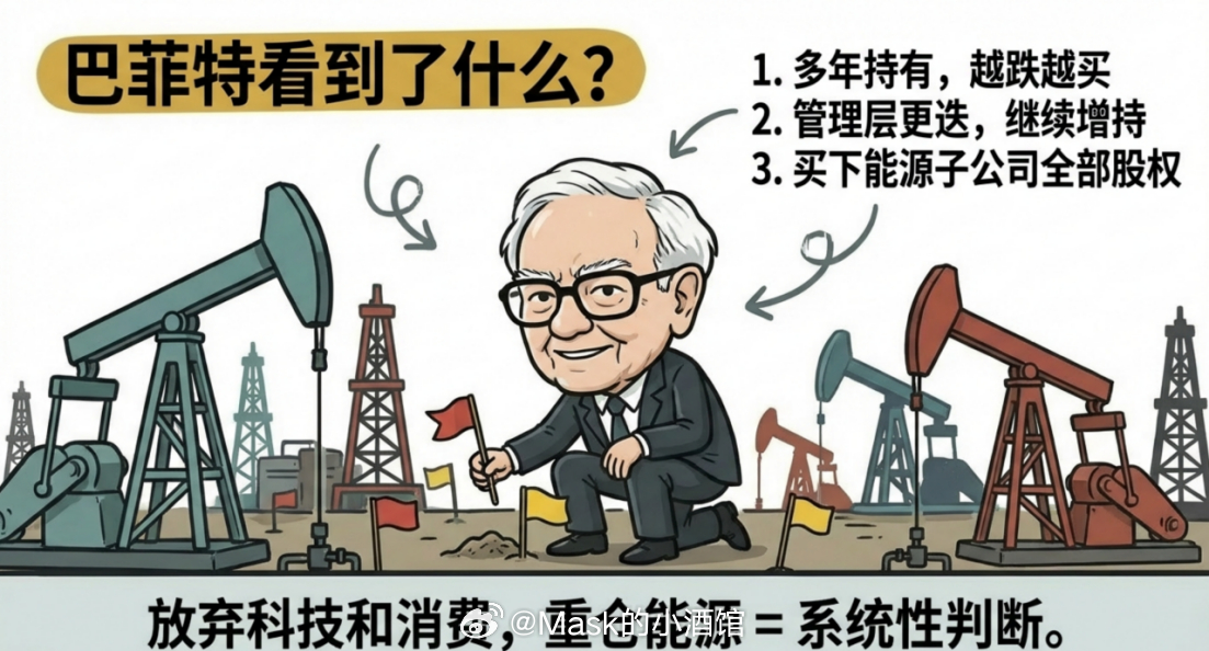 这不正常。这非常不正常。大宗资产之间有一个长期规律:偏高的会回落,偏低的会补涨,最终找到新的平衡。这不是什么玄学,是几十年来反复被验证过的市场规律。黄金已经走在前面了,大步流星地往前跑,石油现在就是那个明显偏低的、在后面慢慢悠悠的那一个。落后不代表不会追上来,往往意味着追上来的时候,弹性会更大。而且不止我看到了石油的超级周期,巴菲特也看到了石油的超级周期。巴菲特的公司,这些年一直在用真金白银押注能源。买了大型石油公司的股权,持有多年,越跌越买,从来没有动摇过。后来新的管理层接手,不但没有卖出,反而继续增持,还把旗下能源子公司剩余的股权全部买下来,一股不剩,彻底拿满。你要知道,巴菲特的公司账上趴着大量现金,他完全可以去买科技股、去买消费品、去做各种各样的投资。但他偏偏选择能源,而且连着两届管理层都在同一个方向上加注。