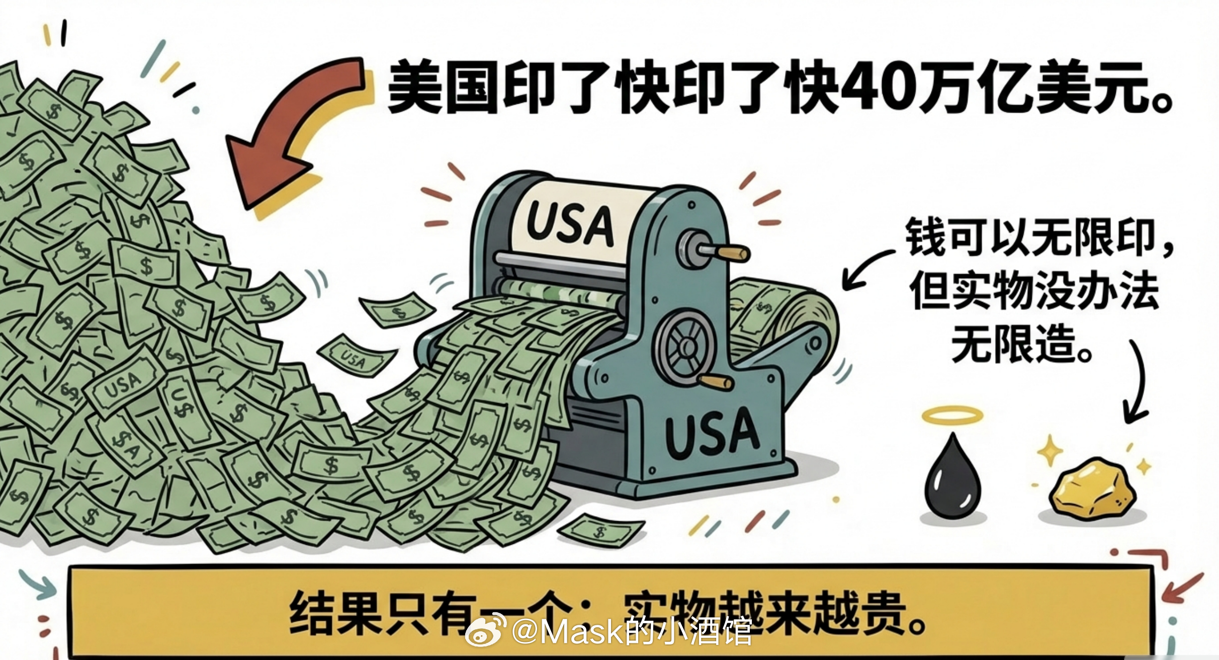 最近很多人问我,美伊冲突这么乱,黄金石油会不会大涨?我说你搞错重点了。冲突会影响短期价格,但决定长期走势的,根本不是冲突。真正的答案,藏在一个你每天都能感受到、但从来没认真想过的问题里——美国印了快40万亿美元,但它印不出哪怕一滴石油,哪怕一克黄金。