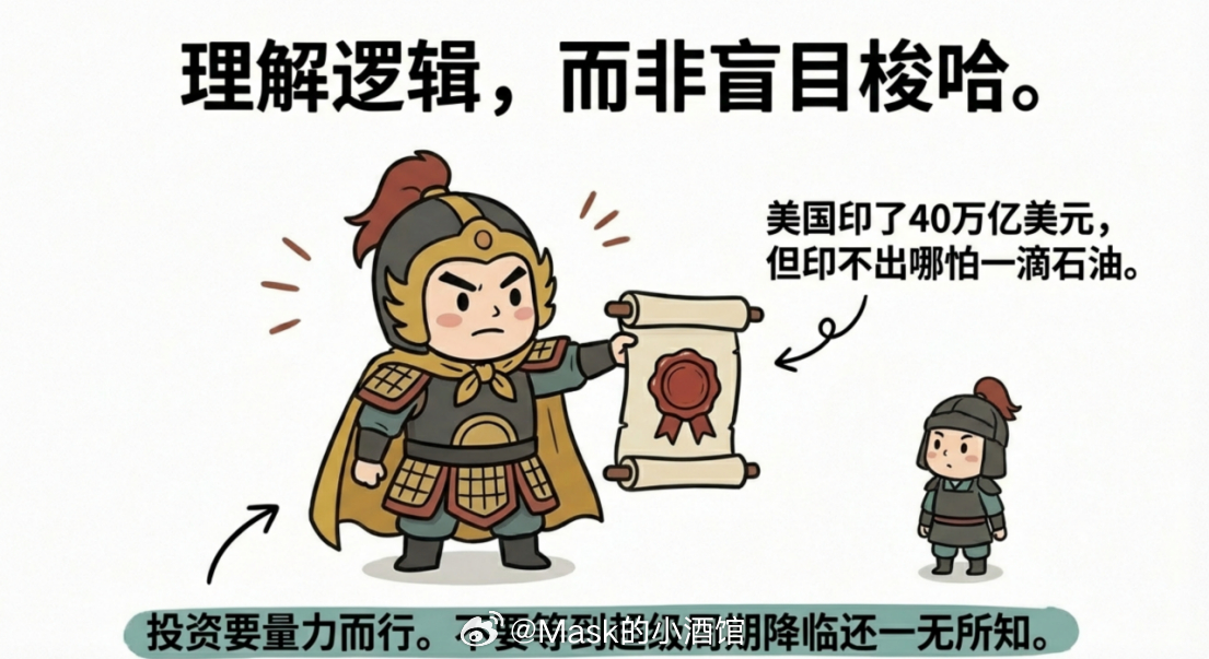但我希望你能真正理解这个逻辑,而不只是记住一个结论。而且这个逻辑太简单了,简单到所有人都可以理解,美国印了快40万亿美元,但它印不出哪怕一滴石油,哪怕一克黄金。黄金是先行者,石油是迟到者。石油虽然迟到,但是不会缺席。
