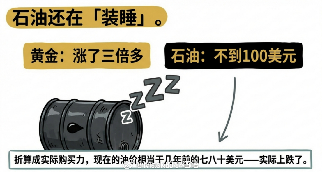 黄金从1600多美元,一路涨到了现在5400多美元,已经涨了三倍多。很多人觉得黄金涨得太快、太高。但如果你理解了上面这个逻辑,你就会明白,黄金涨的不是黄金本身,而是美元在跌,是钱越来越不值钱,是同样一克黄金需要更多的美元才能买到。但石油呢?现在还不到100美元一桶,跟几年前比,几乎没什么变化。你有没有觉得哪里不对?同样是实物资产,同样面对美元贬值的大背景,黄金涨了三倍多,石油却跟没事人一样,还在原地趴着。折算成实际购买力,现在的油价相当于几年前的七八十美元,等于实际上还跌了。
